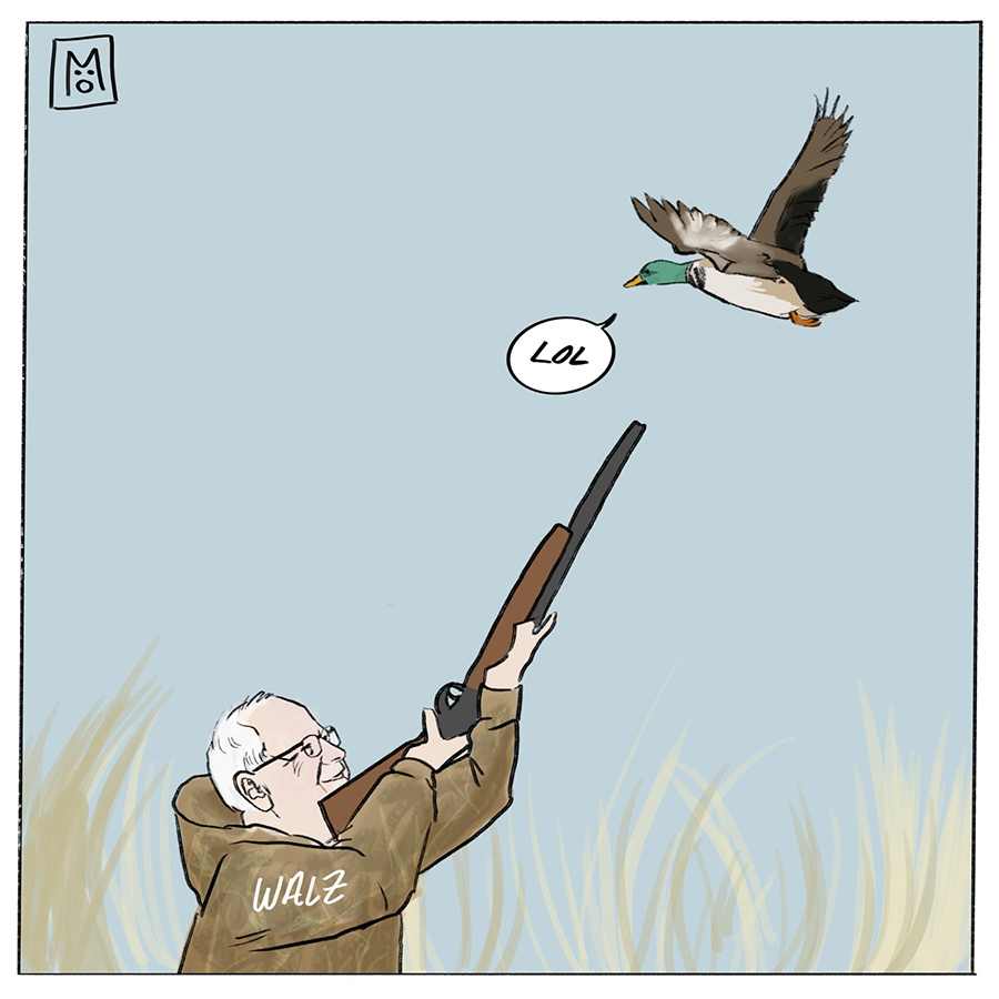 LifeSavor October 19, 2024 at 8:24 pm Tim Walz crouches twixt shade and blind With guns and gadgets of every kind This nonsensical man With pluck and luck Is hoping to outwit a duck. Yes, I recognize that I owe Ogden Nash an apology. Reply