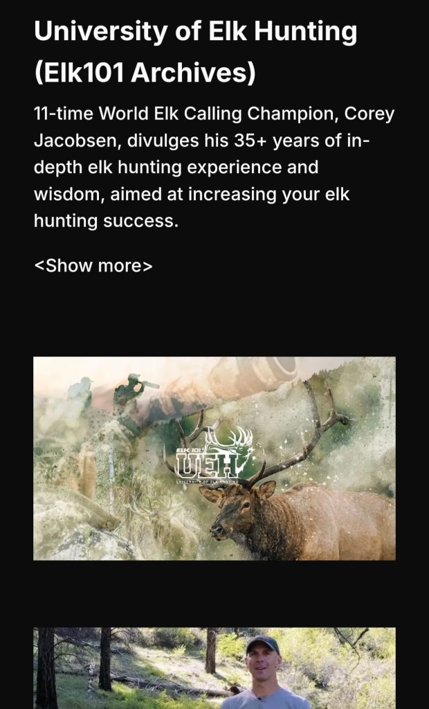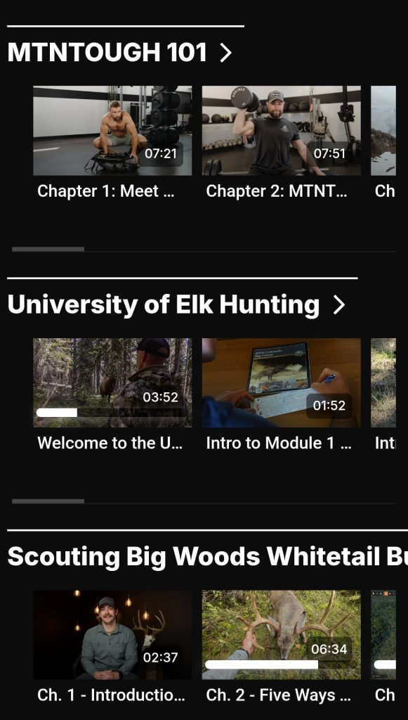 Then there’s the University of Elk Hunting section. This is a whole ‘nother level of information, focused entirely on elk hunting. These aren’t videos, but chapters of information written in prose format and narrated by Corey Jacobsen, a professional with decades of experience calling and hunting elk.