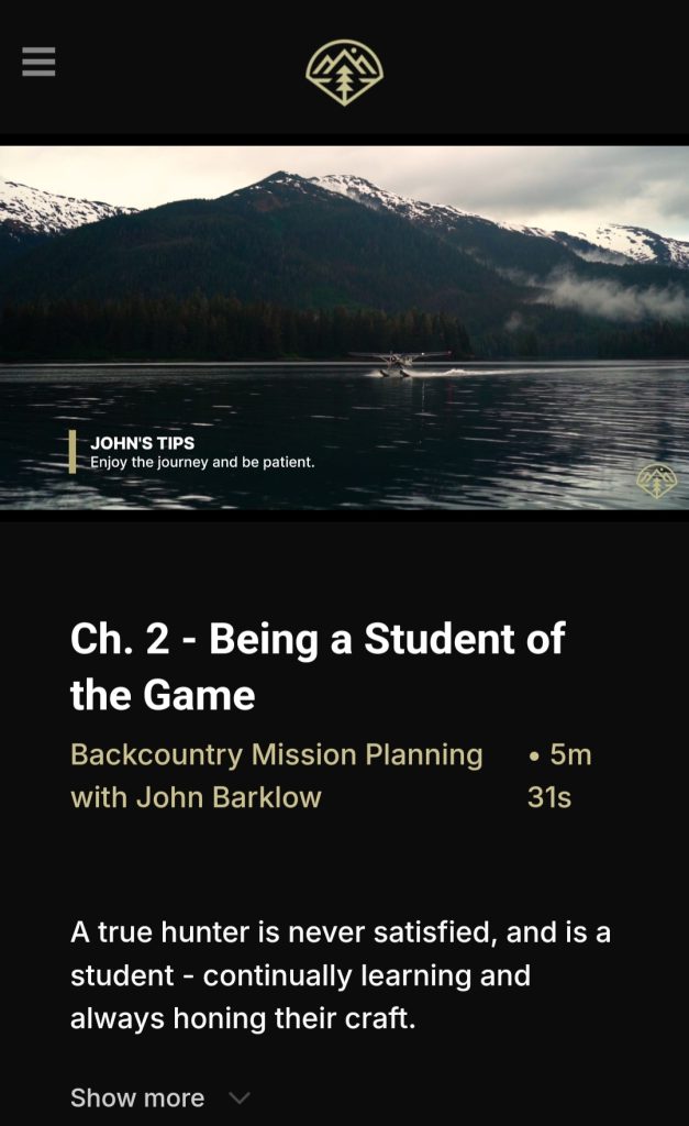 There are some short videos and photos embedded in some of the chapters, but really this is long form prose with narration. It’s truly comprehensive. I very much appreciated the section on strategies for drawing a tag, as well as the multiple sections on calling and what to do if calling isn’t working. Really, if you knew nothing about hunting elk and you listen to this course, you’d be far ahead of most of the people who hunt elk.
