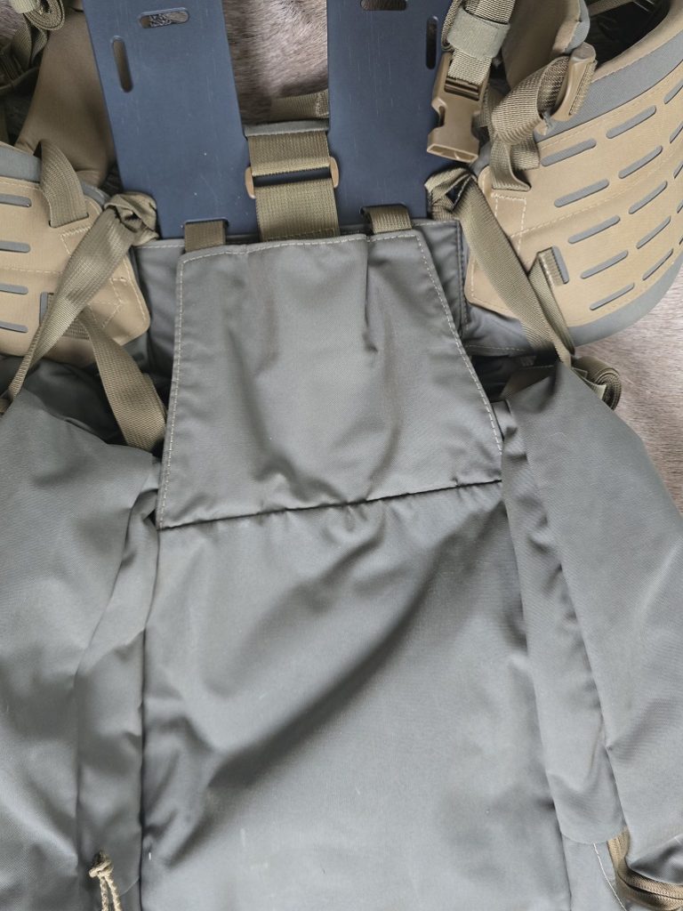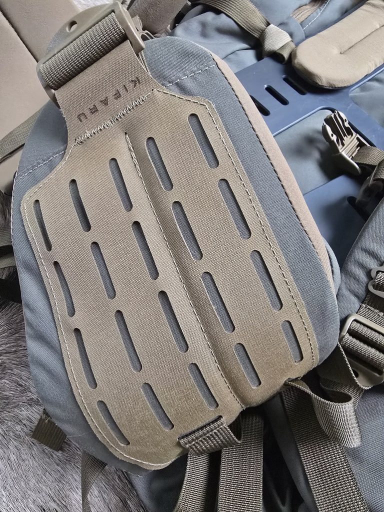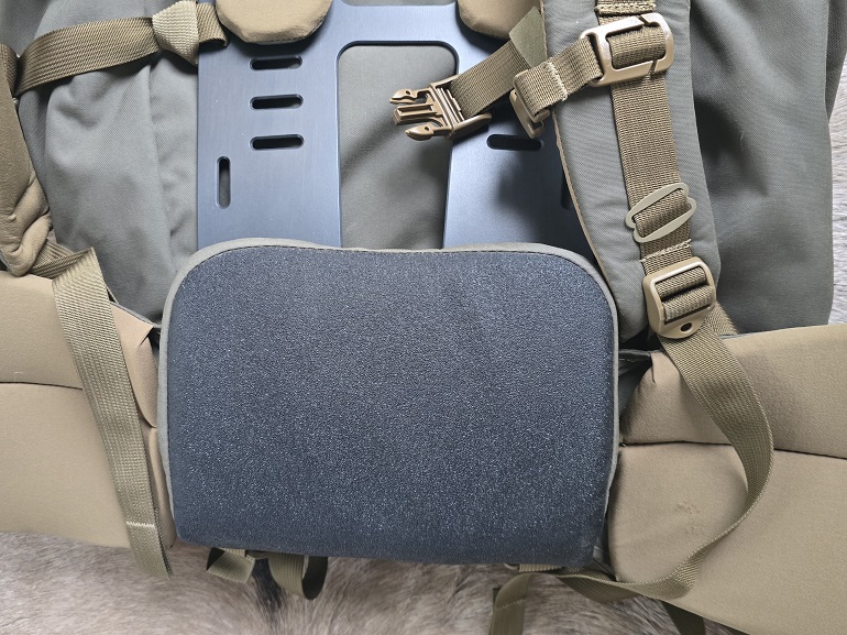 The core of the frame itself is a carbon fiber frame sheet. Kifaru claims in their videos that they’ve run it over with a fork lift, dropped it off buildings with 150lbs in it, and more. I believe it. I weigh just over 200lbs. I propped it up between two chairs and stood on it, without effect. At the same time, it has a small amount of flex in it, perfect for moving with the body while keeping loads still. Big cut-outs in the center form a cross bar layout. I’m sure those big cut-outs in the middle of the frame were made to reduce weight and increase strength but they have the secondary advantage of adding space for airflow under the pack. Any bit there helps.