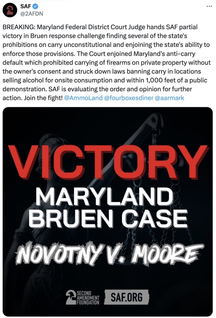 A federal court in Maryland has handed a victory to the Second Amendment Foundation and its partners in a challenge of the state law restricting carry in certain locations, declaring three provisions in the statute to be unconstitutional. The case is known as Novotny v. Moore.