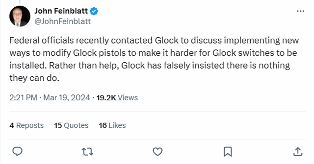 “On the very day the suit was filed, Everytown for Gun Safety President John Feinblatt posted on X, ‘Federal officials recently contacted Glock to discuss implementing new ways to modify Glock pistols to make it harder for Glock switches to be installed. Rather than help, Glock falsely insisted there is nothing they can do.’”
