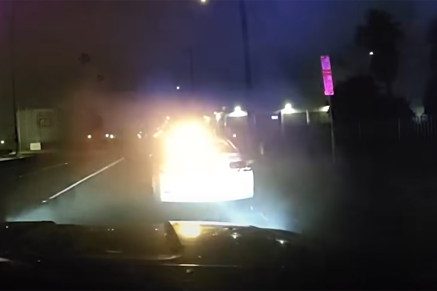 For those who can’t watch the video right now, it’s a pretty simple story. When police attempt to pull the driver over, he initially runs, but then stops. When police get ready to approach him, the bullets start to flyrough t with the suspect shooting full auto through the car’s back window. Some return shots are fired, and then the suspect drives off. Stunned at what just happened and confused about what kind of weapon was used, with one officer bleeding in a cruiser with a damaged radiator, the pursuit ended and other officers took over.