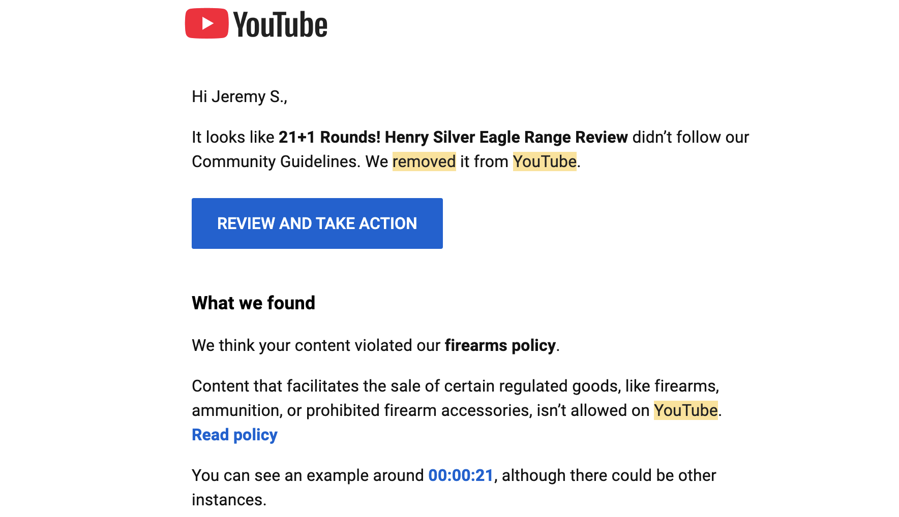 FYI I don’t actually think this is what YouTube is doing. Because of the randomness of the age of the videos that YouTube has been removing from our channel over the last couple years, I believe it’s anti-gun activists who see videos they believe they can get removed, they report them by clicking the button to report violations, YouTube either manually reviews or runs it through an AI or other algo, and then this process happens. If it were an automated program that immediately reviews everything like the WordPress comment spam program on SNW here, videos would get flagged almost immediately. But sometimes it’s a video that’s well over a year old, sometimes it’s 3 months old basically at a minimum. And YouTube is clearly more than happy to remove any firearm-related content they can get away with.