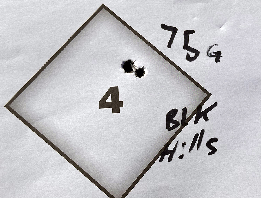 The 75 grain load posted a ¼-inch group and the other two were ⅝-inch. While I’d have been successful with any of them, I stuck with the 75 grain Black Hills load for the remainder of the testing.