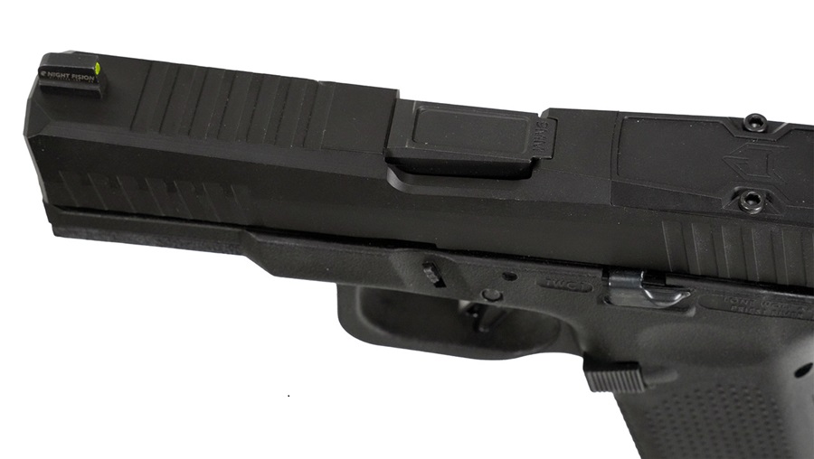 Topping the slide are the Night Fision lower 1/3 night sights. These sights feature a tritium vial front sight installed with an injection molded sleeve. LWA says these are the brightest night sights on the market, and produce what they refer to as The Perfect Dot. If you’re going to run a pistol optic, it makes a lot of sense to get away from the full suppressor height sights. They get in the way of the view and just occlude too much of the optic’s window. These lower 1/3 co-witness sights should be just the ticket to be there if you need them but not be in the way when you don’t.