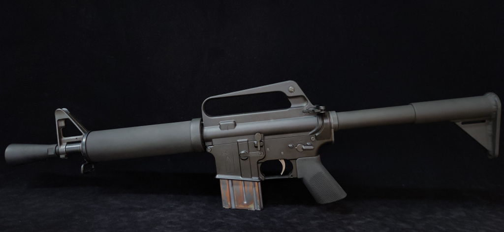 One of the odder, but more interesting early M16 variations was the Colt Model 608. The 608 was a chopped M16 built to be an aircrew survival rifle. It used a 10-inch barrel with a conical flash hider and a simple fixed tubular stock. It was designed to be stored disassembled with the upper and lower separated, so the total length stored was only 17.6 inches long. They even chopped the pistol grip to keep the size down.