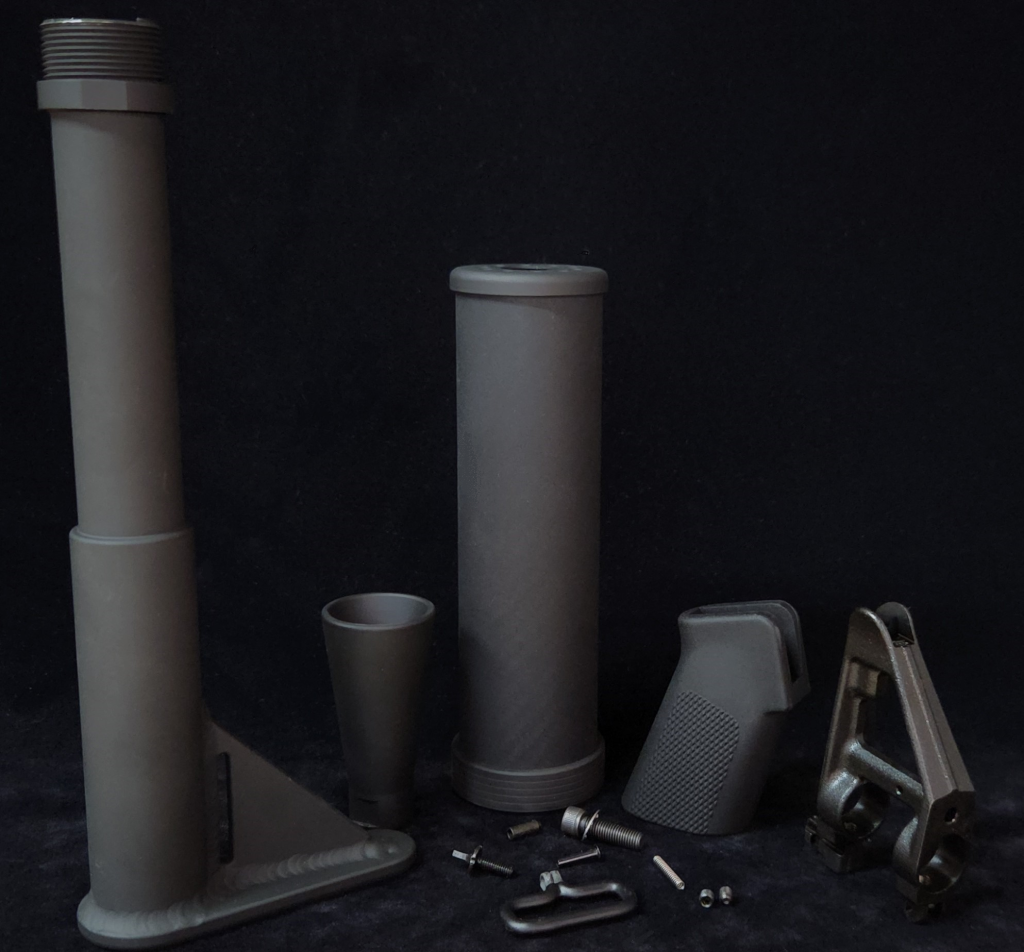 The kit includes a cone-shaped muzzle device, a pre-assembled drilled and tapped non-F-marked front sight base with set screws, an end plate, a carbine length carbon fiber tube handguard, a barrel nut, a chopped stubby grip and grip screw, and a fixed stock with locking ring.