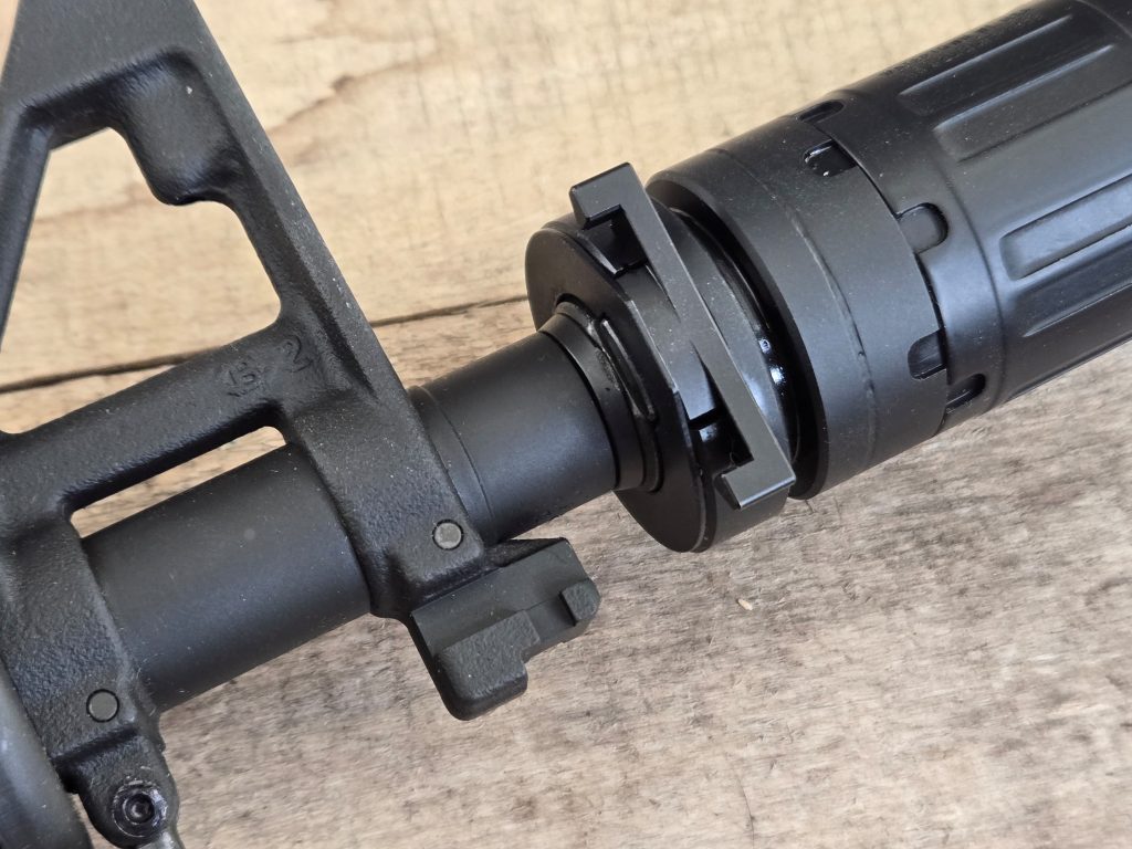 With the gate open slide the suppressor over your flash hider. You have to align the mount with the flats on the sides of the A2 flash hider. Those are what it locks up on. You can actually slip the suppressor past that point, but if you do, the suppressor won’t lock on correctly and will obviously be loose and wobbly.