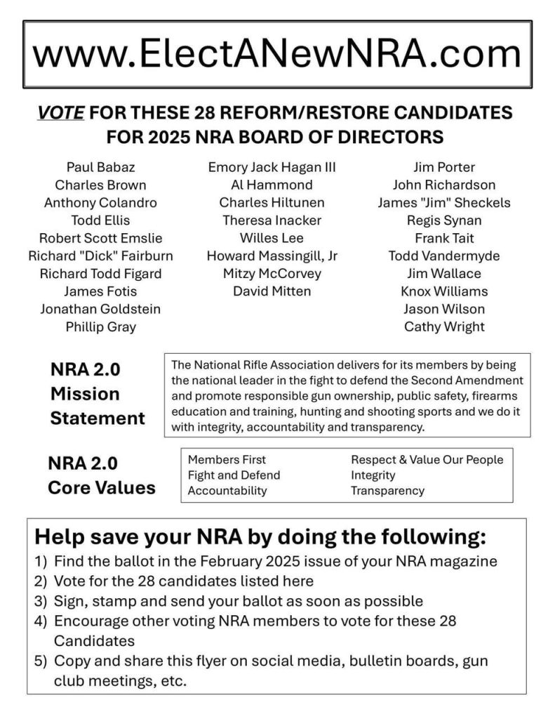 Members will receive their election ballots beginning this week in the centerfold of their NRA magazines. A slate of 28 reform candidates are running on a platform of integrity and transparency, attempting to replace the ‘old guard’ that enabled Wayne LaPierre and others to self-deal and undermine the confidence of members, resulting in millions of dollars in legal defense expenses, some of which has been recouped from Mr. LaPierre. This is a battle of the old guard and the reformers.