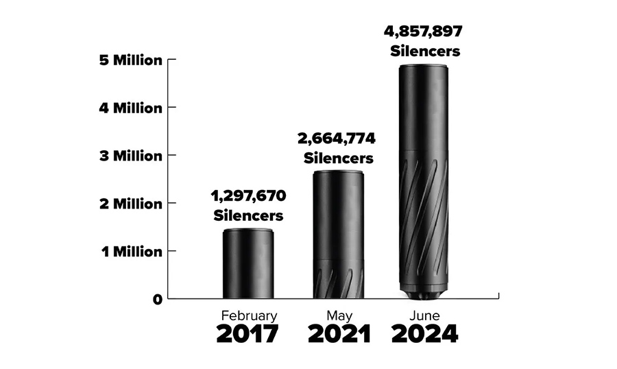 In a recent Freedom of Information Act request, NSSF received from ATF the additional number of silencers registered from May 2021 to July 2024. An incredible 2,193,123 more suppressors are now protecting the hearing of hunters and shooters. That means a whopping 4.86 million silencers and counting are now in the possession of law-abiding Americans.