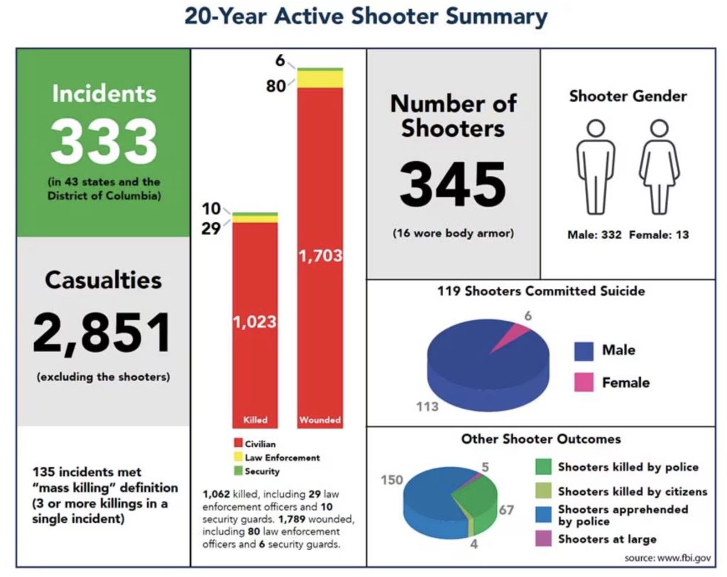 According to the FBI’s landmark study, “Active Shooter Incidents 20-Year Review, 2000-2019,” roughly 5% of the active shooters wore body armor during their mass murders – 16 of the 345 shooters – five at open areas, four at business open to the public, three at government buildings, two at high schools, and two at universities.
