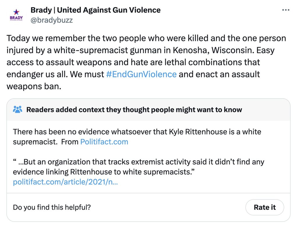 And then there’s the Brady version of what happened. They chose to mark the anniversary as so many have in the last three years…by painting Rittenhouse as a racist (a “white-supremacist” in their telling). Not only is there no evidence whatsoever that Rittenhouse is or ever has been a “white-supremacist,” but all three individuals he shot that night after being attacked (after first trying to flee) were white.