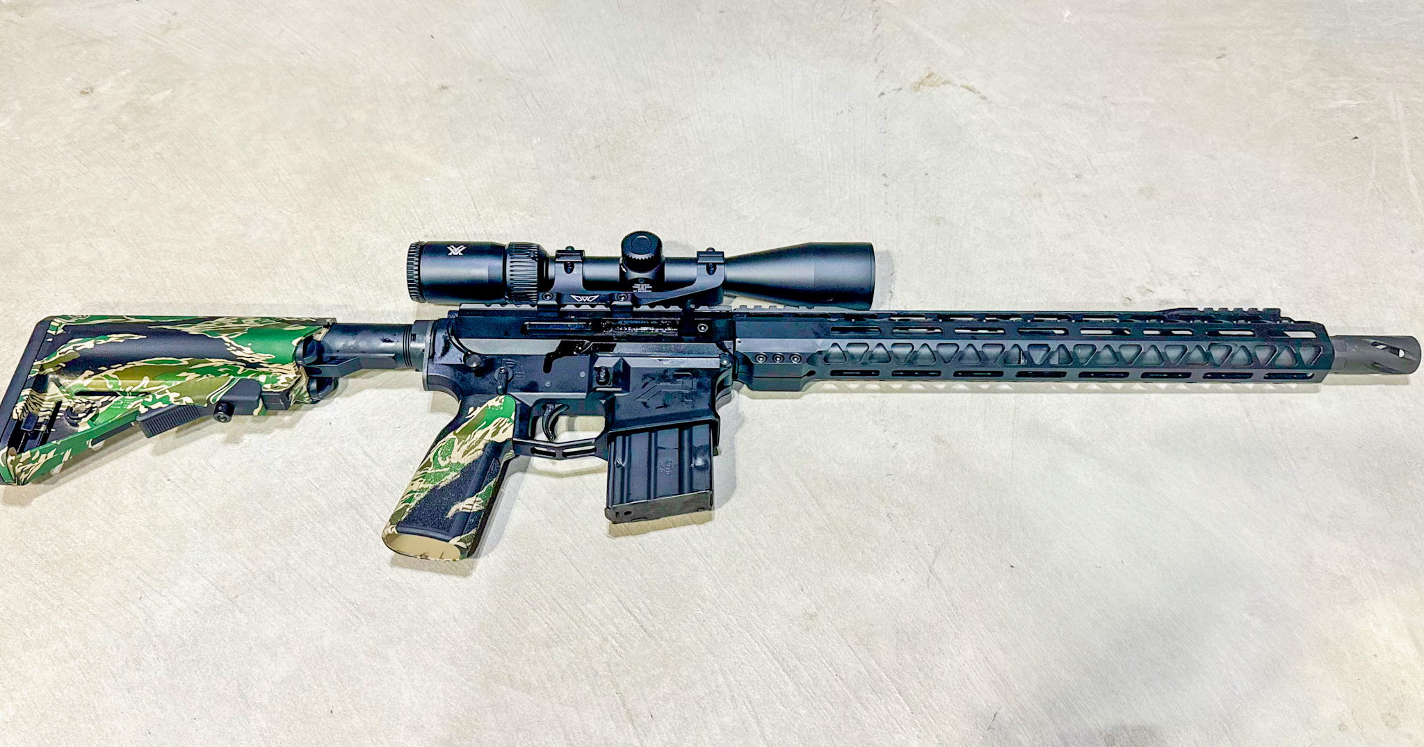 For this season, I used a 450 Bushmaster upper from Bear Creek Arsenal. This is a side-charging model with a 16-inch barrel. I paired it with an Aero Precision lower that I built using extra parts. Overall, it turned out to be a nice package.