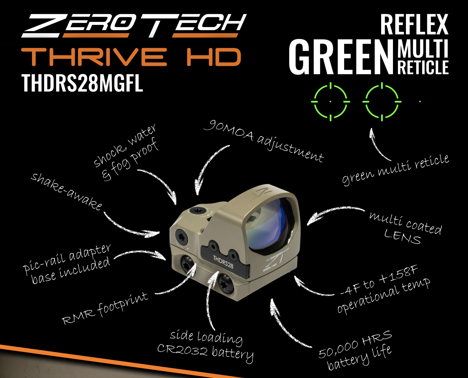 Specifications: ZeroTech Thrive HD multi reticle green dot reflex sight