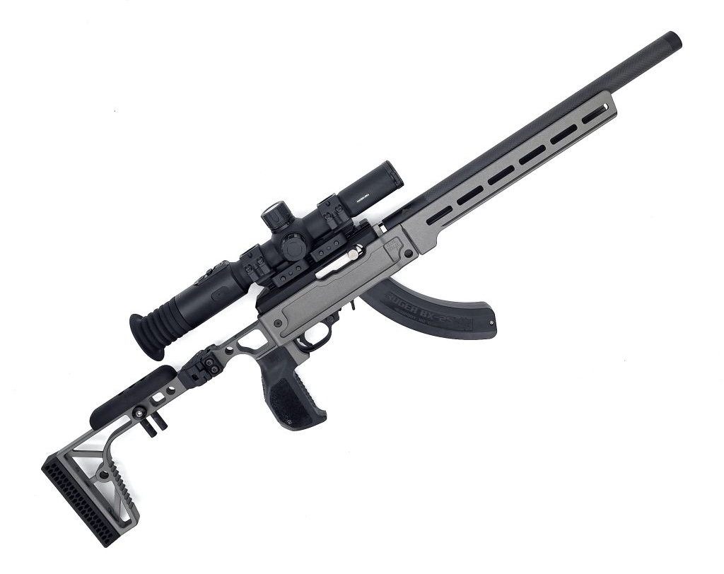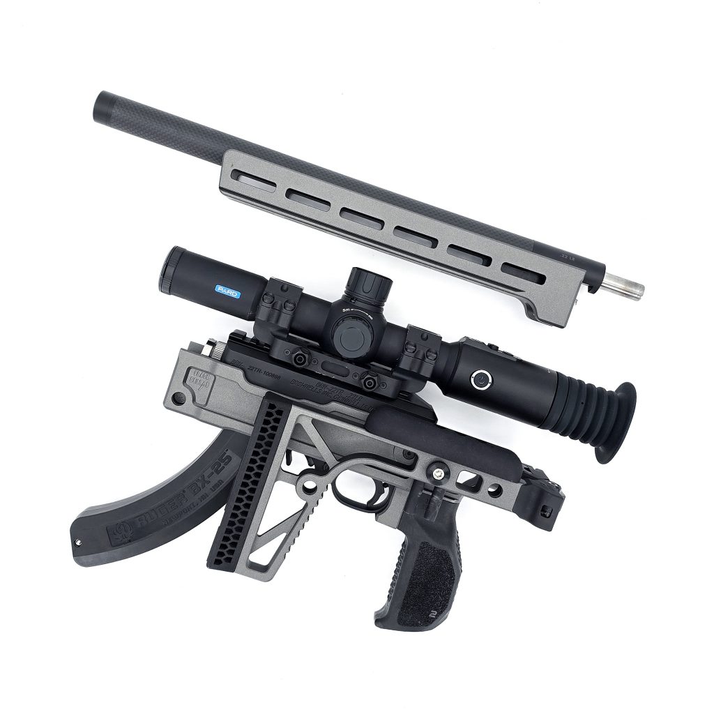 While Steve scoped out the property using a $4,499 thermal clip-on on a Black Collar Arms Piglet Takedown SBR, I had my Frankenstein machine gun taken apart so I could get familiar with the PARD’s menus and settings without pointing a functional firearm at him.
