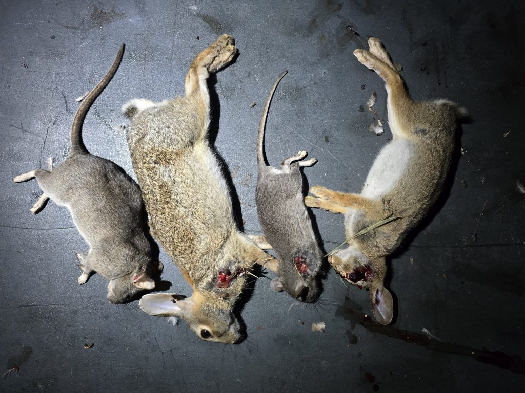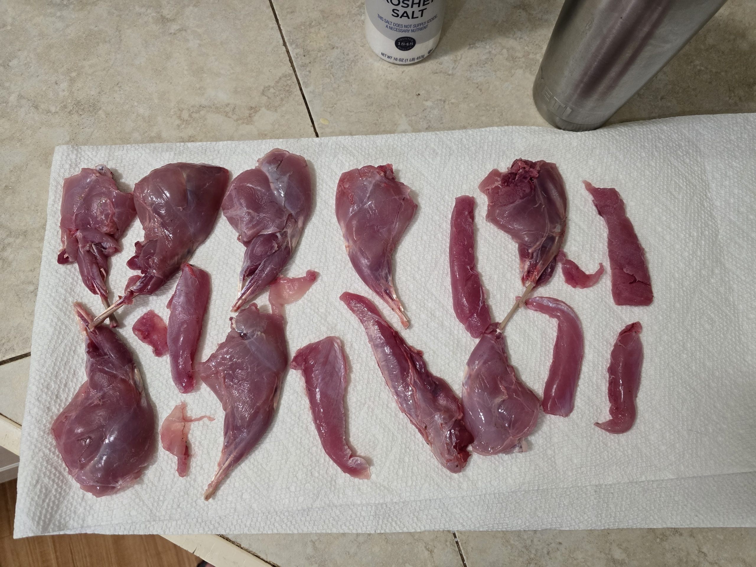 Pest hunting was a success, and I came home with a couple of pounds of rabbit meat. A few of the critters were a bit gross (excessive fleas/ticks/other issues) and were left for the local scavengers to feed on, but most of the bunnies were as clean as household pets and will be delicious.