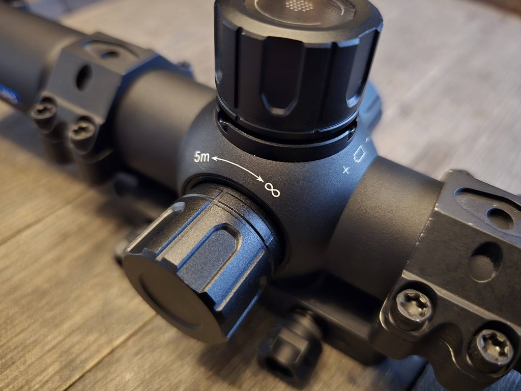 The left-side turret, which on a traditional riflescope would be your parallax adjustment (which many folks refer to as “side focus”), is the objective lens focus dial to match image focus to your target’s range. This is intuitive and easy-to-reach. The knob rotates smoothly with just the right amount of resistance.