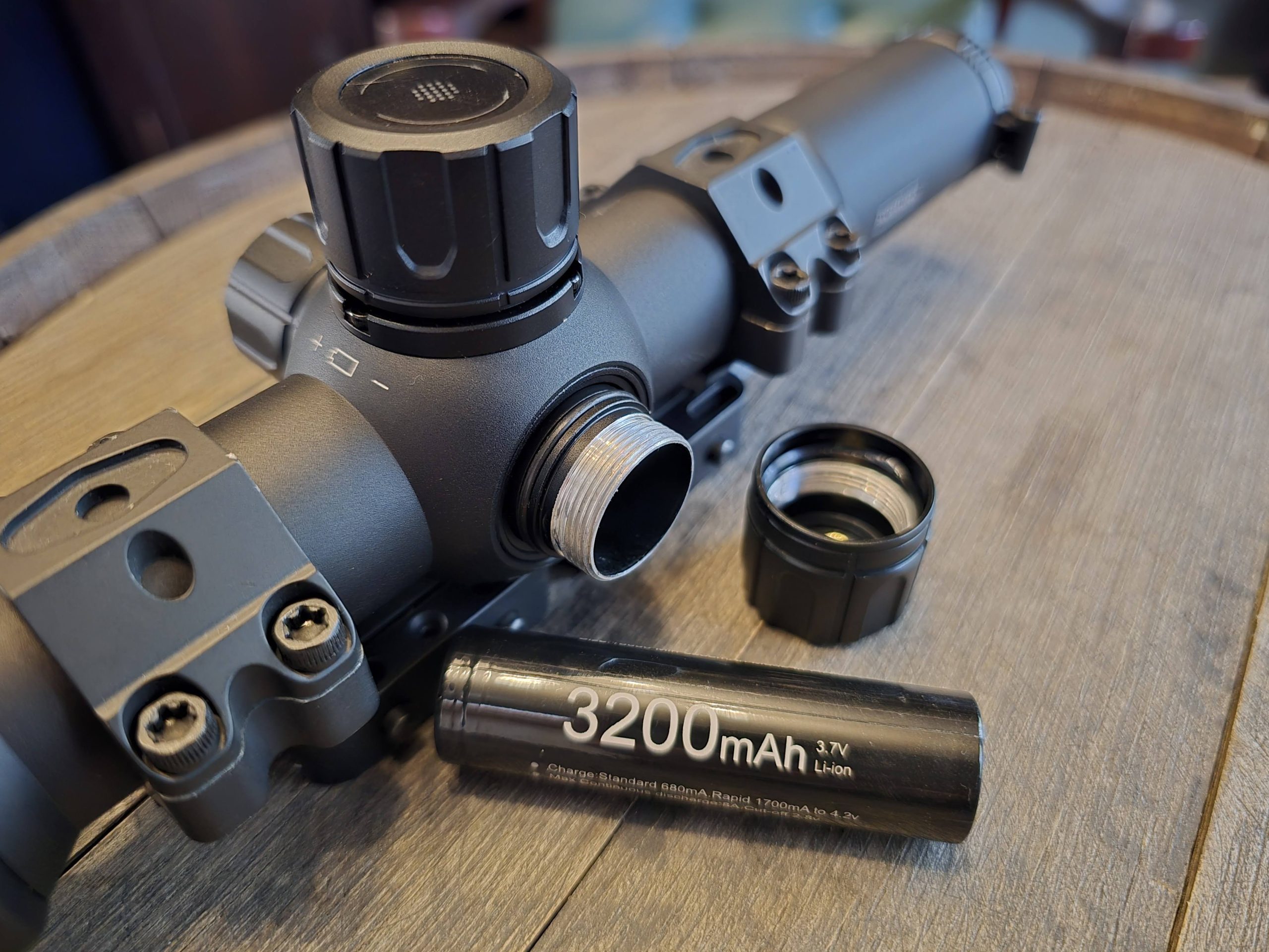 Over on the right side, which would normally be your windage turret, is the battery compartment. Unscrew the cap and a single 18650 rechargeable lithium ion battery drops down inside. PARD says you’ll get up to six hours of run time out of that battery and I think that’s possible, but not highly likely. More on that later.