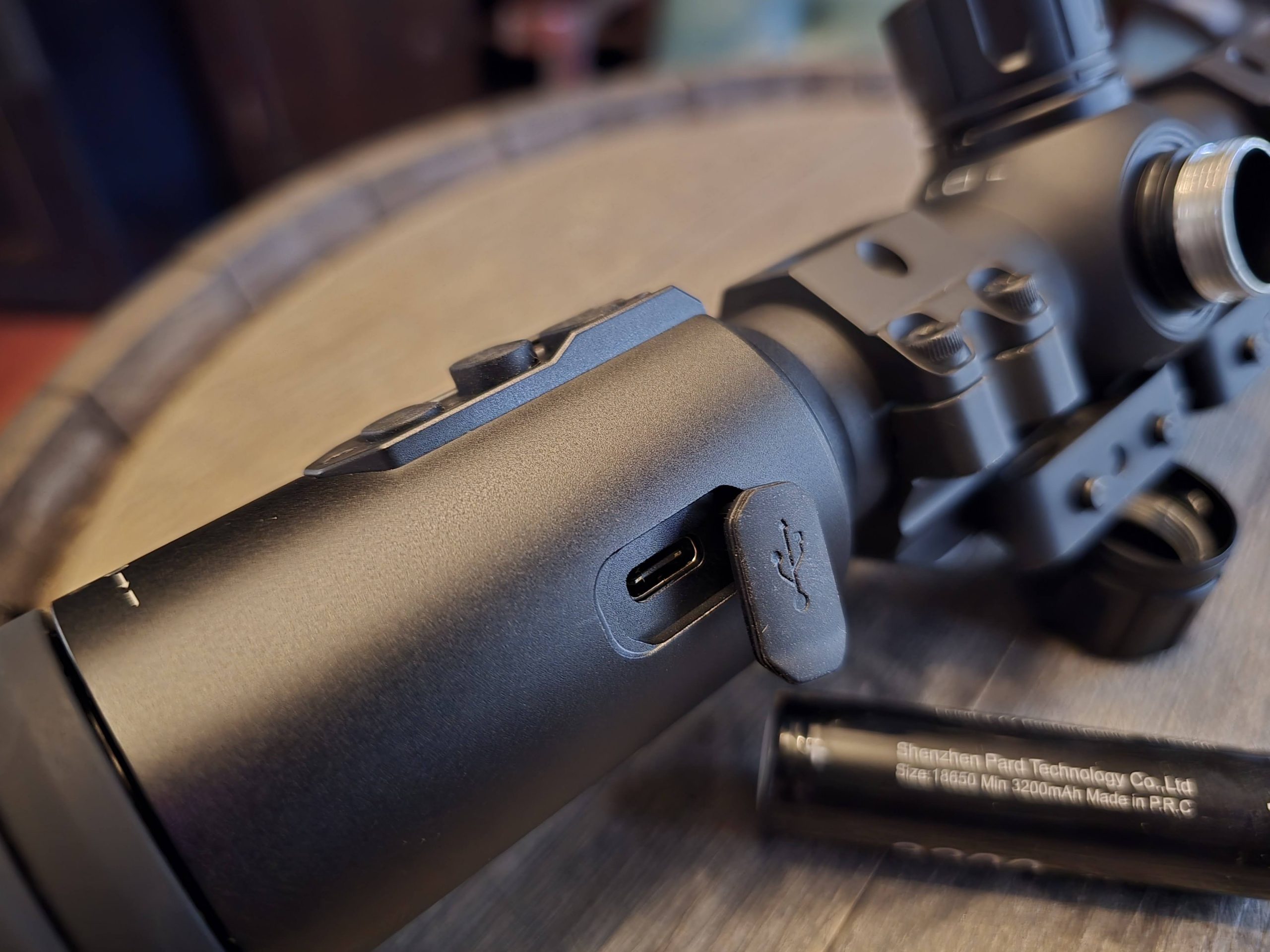 Finally, on the right side of the ocular housing is a USB-C plug. This can be used to charge the battery while it’s still installed in the Pantera, which is nice, and can also be used while the optic is running.