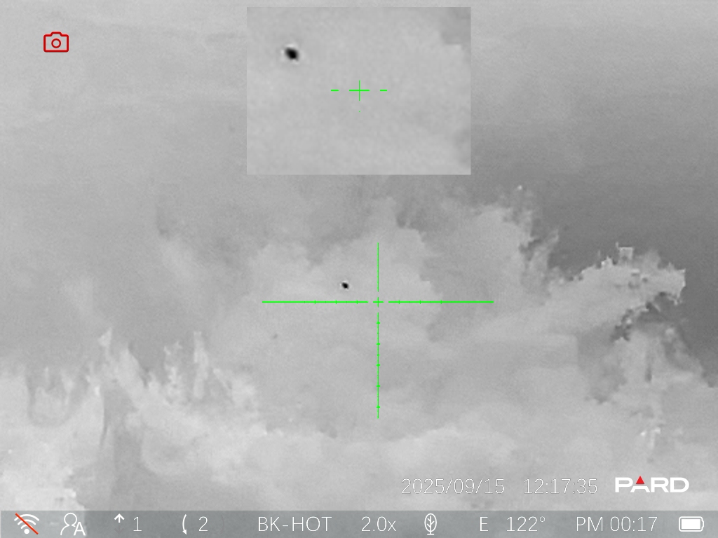 Sighting in the PARD Pantera 256 Q Thermal Scope was very easy and can be accomplished with a single shot (if you trust your gun’s — and your — accuracy). Take your best shot at the bullseye, line up the reticle exactly on the bullseye, and click into the reticle adjustment menu. On your click, the Pantera freezes the image. If you were smart enough to shoot at a target with a good backer like a sheet of plywood or multiple layers of cardboard, you’ll have about 30 seconds to freeze that image with the still-hot bullet hole clearly visible on the target.