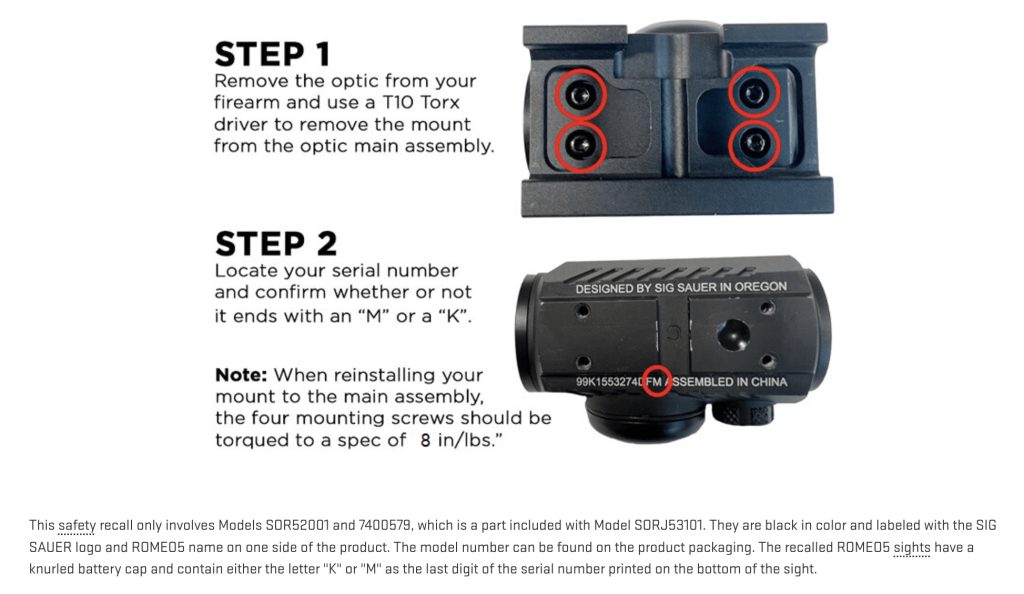 As far as specifics, the recall covers SIG SAUER ROMEO5 Red Dot Sights, Models SOR52001 and 7400579 (a part included with Model SORJ53101). The sights covered in the recall contain either a letter “K” or “M” as thelast digit of the serial number. ROMEO5 owners can find that serial number printed on the bottom of their sight.