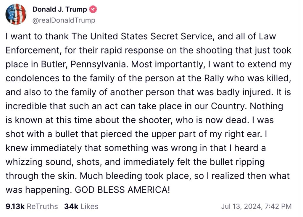 President Trump was holding a campaign rally in Butler, Pennsylvania this afternoon when what sounded like as many as five shots rang out. Video showed Trump grabbing his right ear before Secret Service agents tackled and covered him. When he stood up as the agents began moving him off the stage, he clearly had blood coming from what appeared to be the top of his right ear.