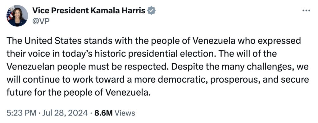 “The United States stands with the people of Venezuela who expressed their voice in today’s historic presidential election. The will of the Venezuelan people must be respected. Despite the many challenges, we will continue to work toward a more democratic, prosperous, and secure future for the people of Venezuela,” Harris said in a social media post.