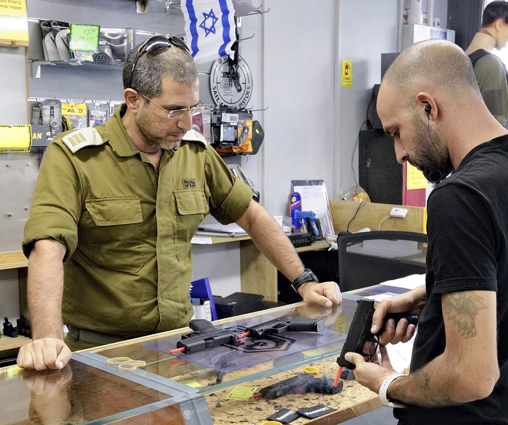 For the average Israeli, guns are simply a tool for protection against the Arab violence that has shaped this society over the last century. Like the army, they’re a necessary evil. Most of the armed people you’ll see in an Israeli city are soldiers or police. In the United States, according to a Pew study last year, 32 percent of citizens own guns. In Israel, it was under 2 percent