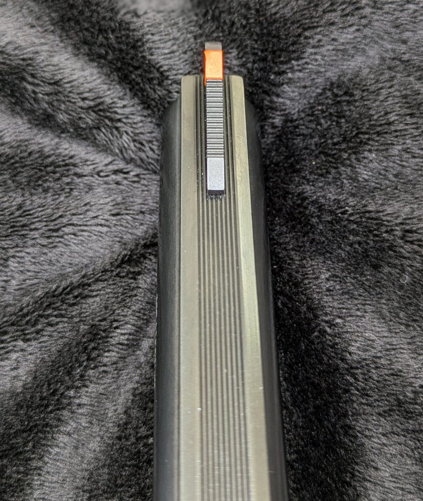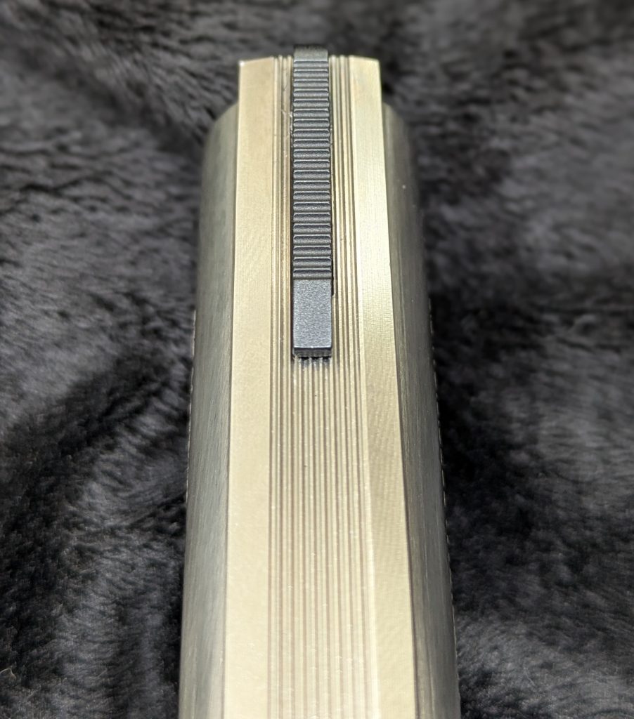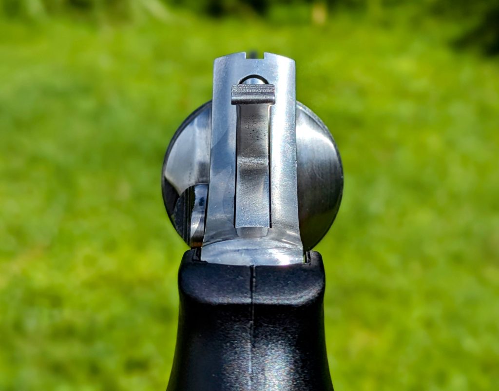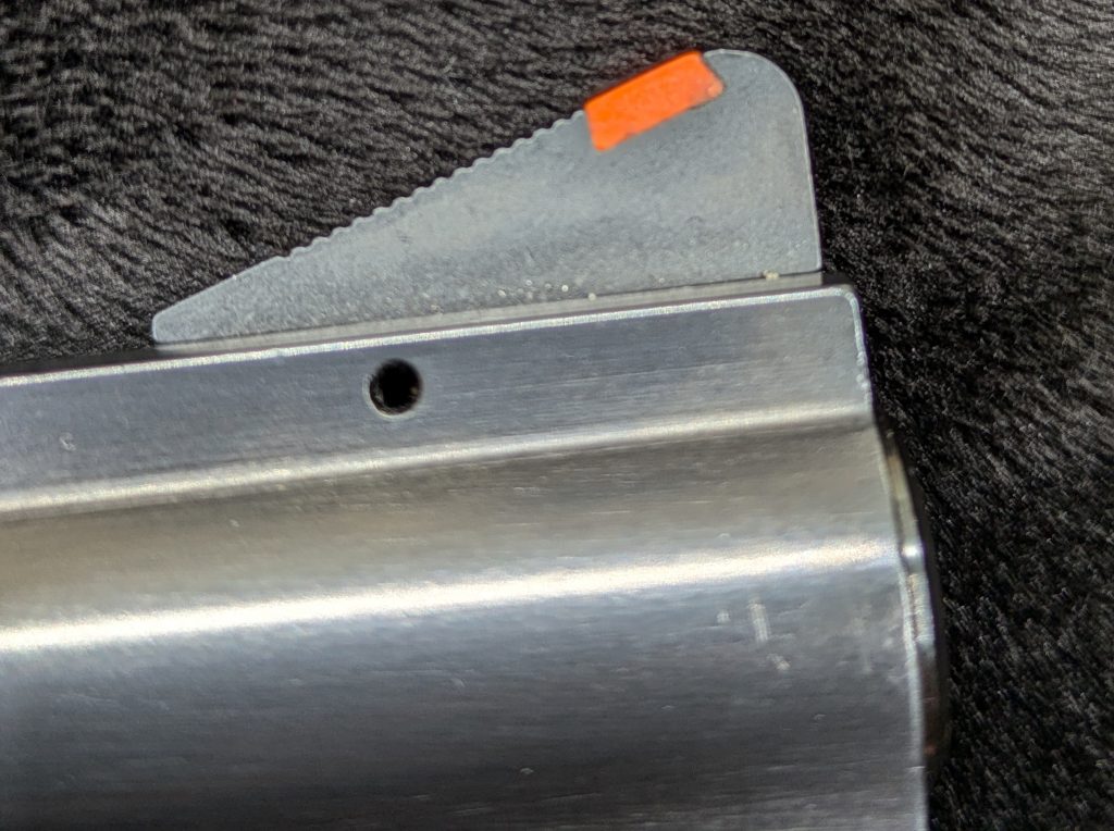 The rear sight again reminds me of a S&W or 1970s-era Colt Python. It is windage adjustable and has some fine serration cut into the windage drum to reduce glare.