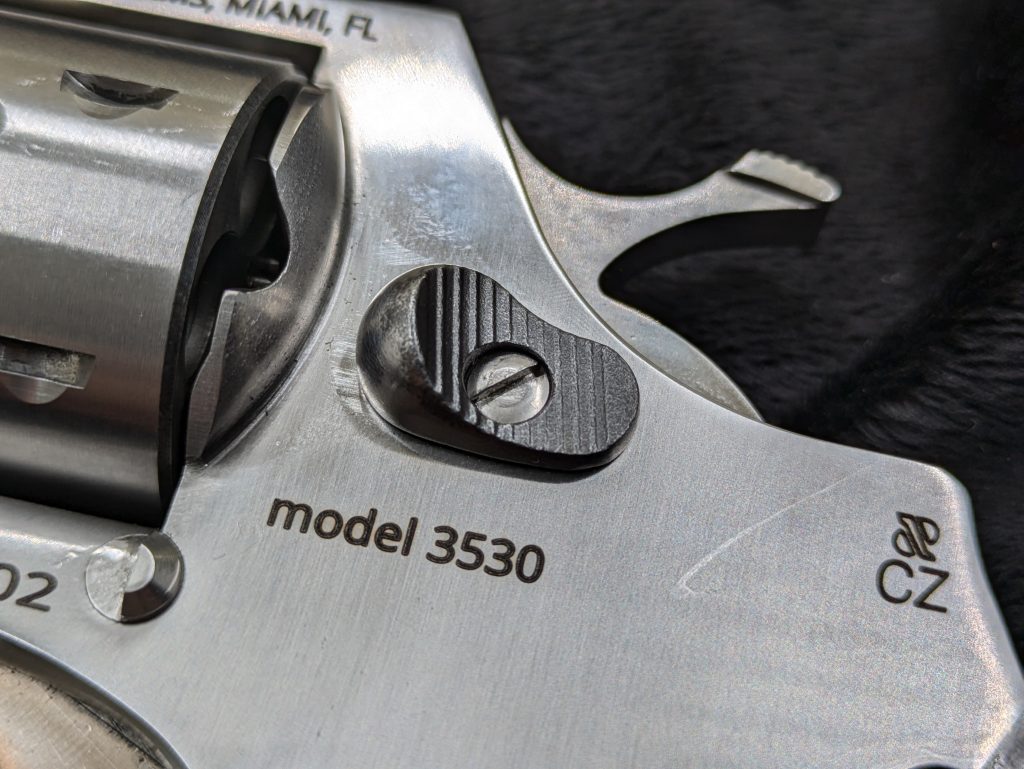 With that ability adjust the trigger, I got the pull weight down to about 11.5 lbs. which, for double action, is still a bit heavy, but not awful. Also, the trigger face is serrated as we’re seeing on current production Colt Pythons. But the trigger itself is rounded off, unlike the current production Colt Pythons.