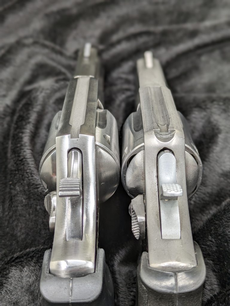 On both R-1 guns, the cylinder release latch is absolutely fantastic. It’s a push-forward Smith-style button that’s nicely shaped and doesn’t get in the way of HKS speed-loaders.
