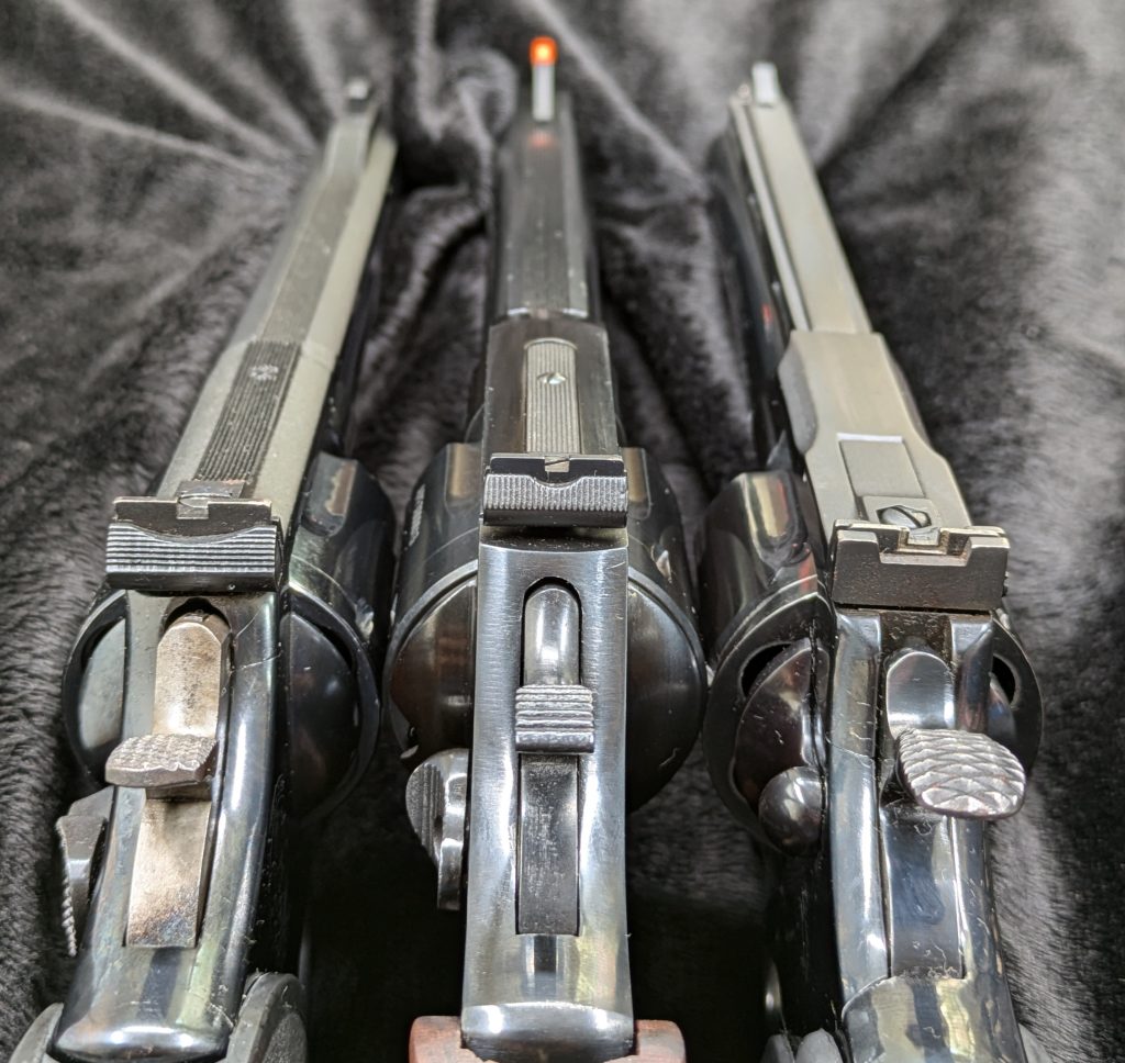 S&W Model 19, APF-R1 Model 3561, and Colt Python. Notice the Colt didn’t have recessed cylinders back then.