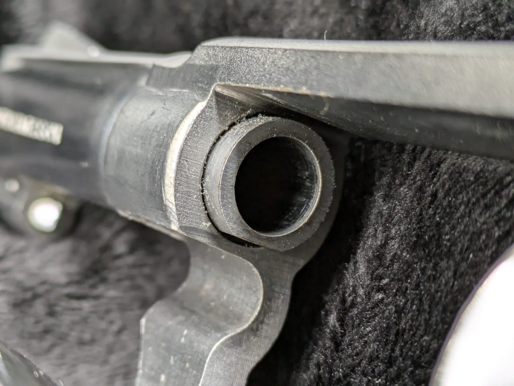 S&W Model 65’s forcing cone. Notice the cut on the bottom, weakening the overall design. An issue that lead to cracked forcing cones if fed a steady diet of .357 Magnum ammo.