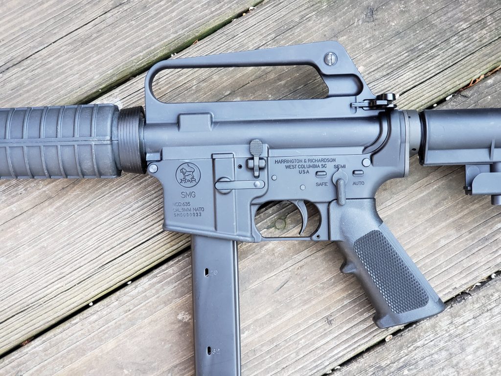 When I got my lower half you could get any color you wanted…as long as it was black. I picked up a complete lower half with CAR stock and repro A1 grip. The guns are engraved with the H&R lion in a circle, right where the rearing horse logo would be on a Colt. Below that it’s marked with a large “SMG” like the originals. Then MOD: 635 and CAL: 9mm NATO then the serial number which starts in SMG. Whereas the Colt’s used a standard M16  or AR-15 lower with a pinned magazine adapter, the H&R’s use lowers with dedicated 9mm mag wells cut for the Colt pattern magazines.