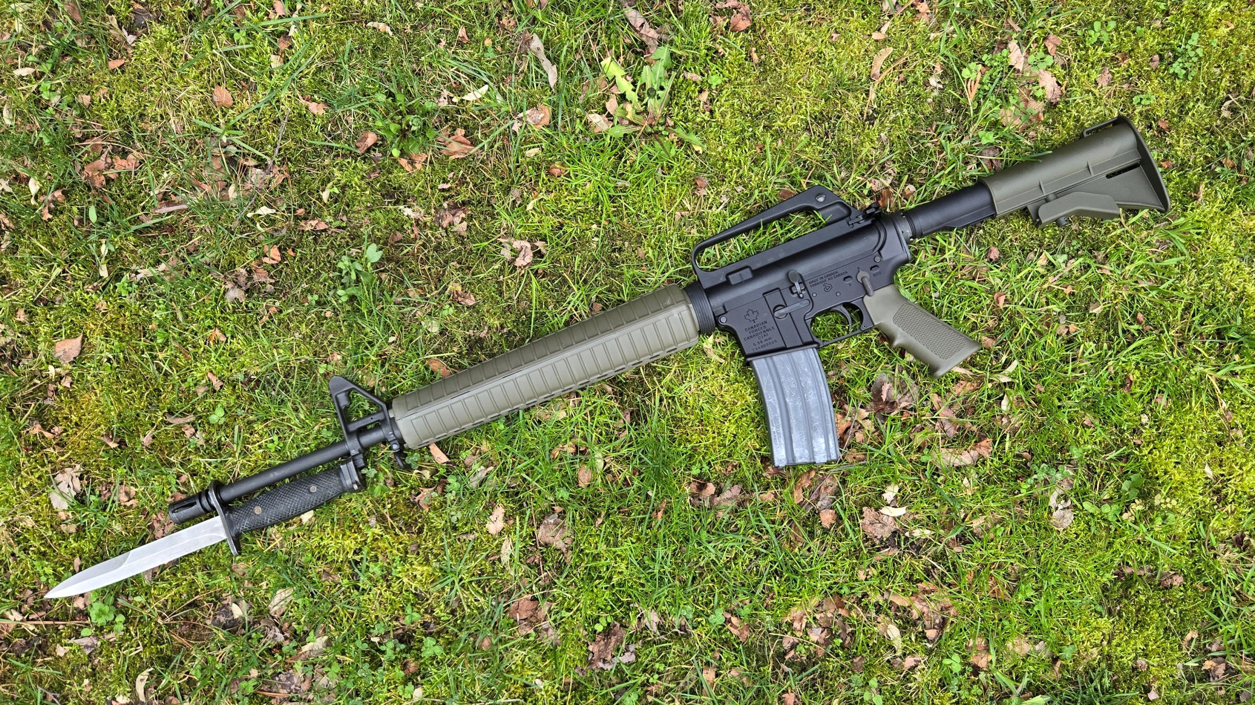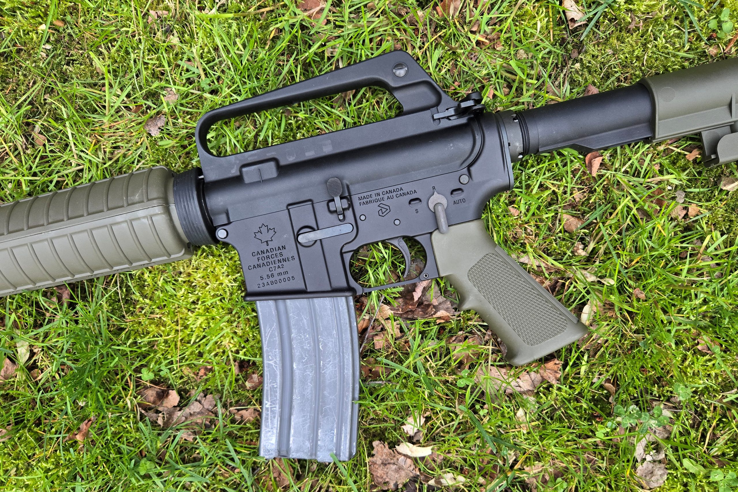 The C7 series uses A2 grips and A2-style round handguards. Early models had black stocks and later ones were green. They use an Elcan sight, and a Diemaco backup iron rear sight. There are other specific differences between it and the US M16 variants, but that’s the general layout.