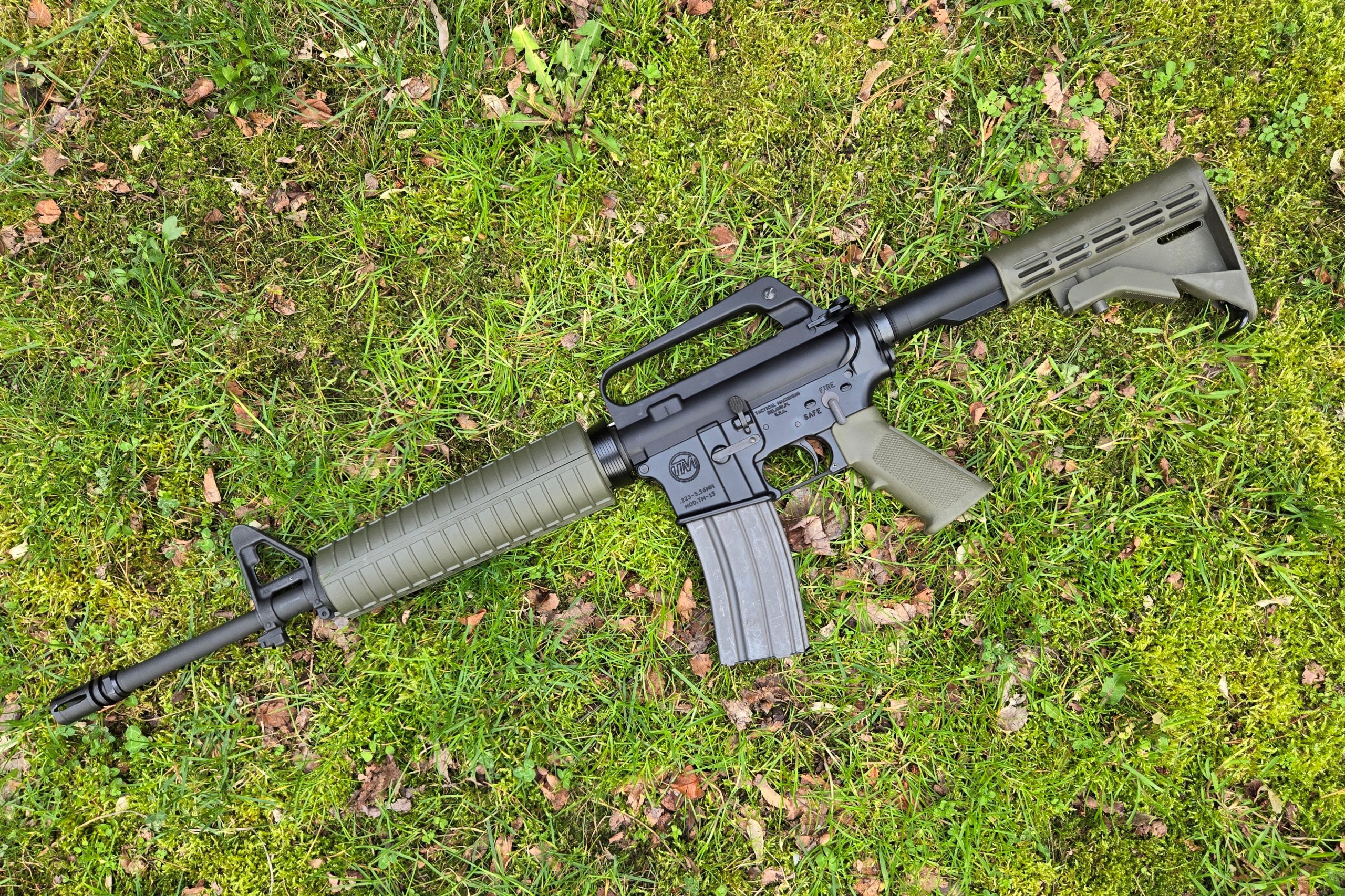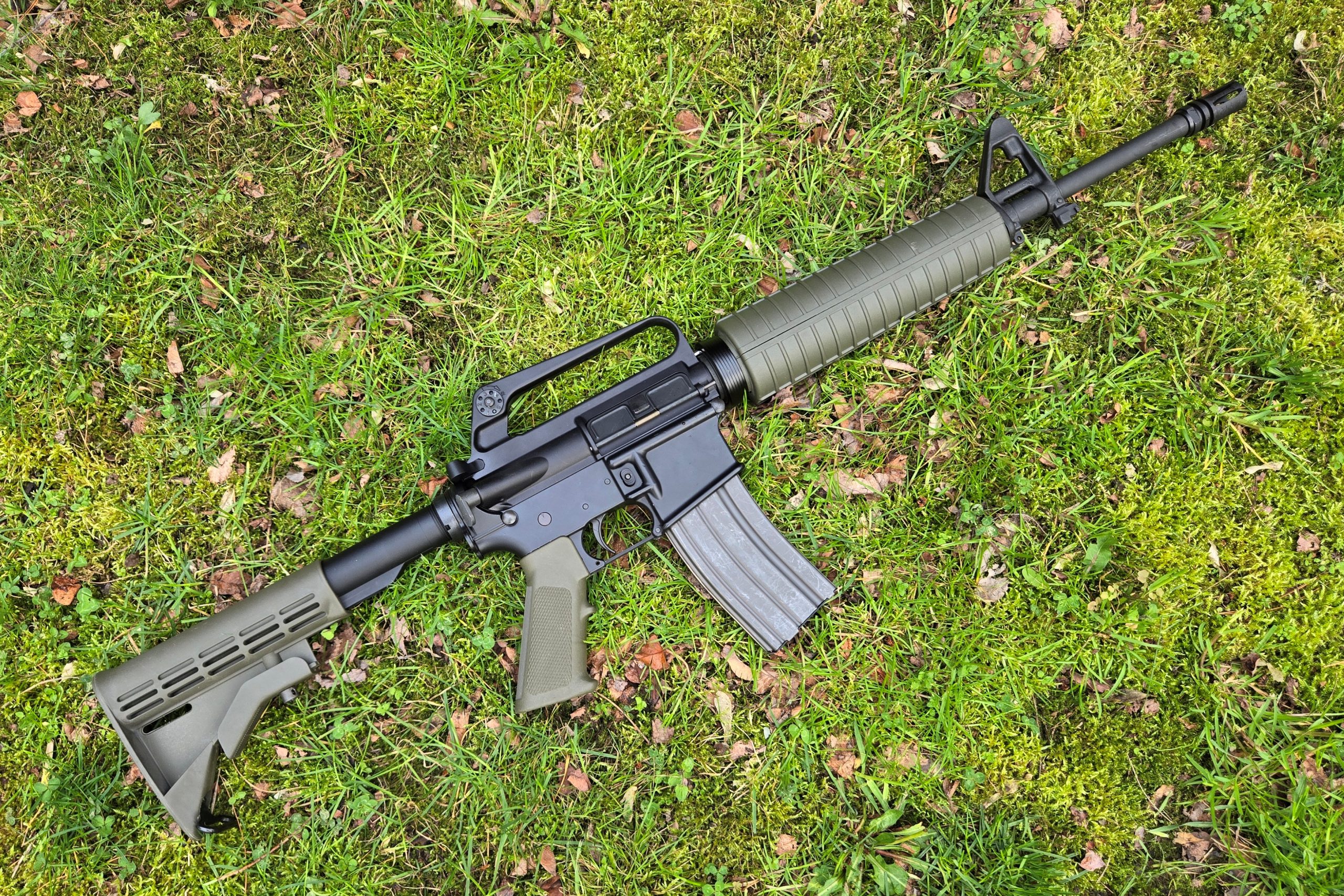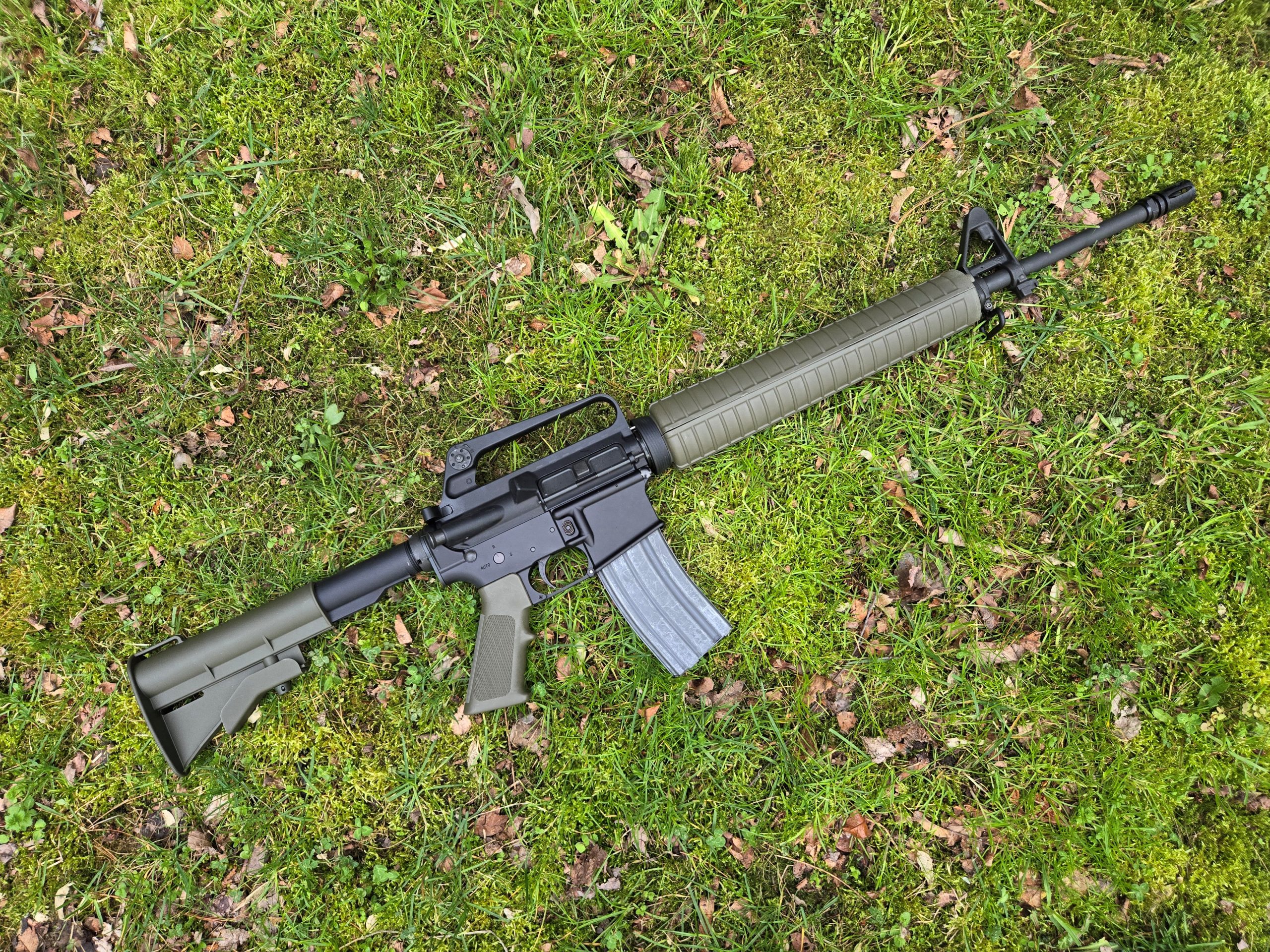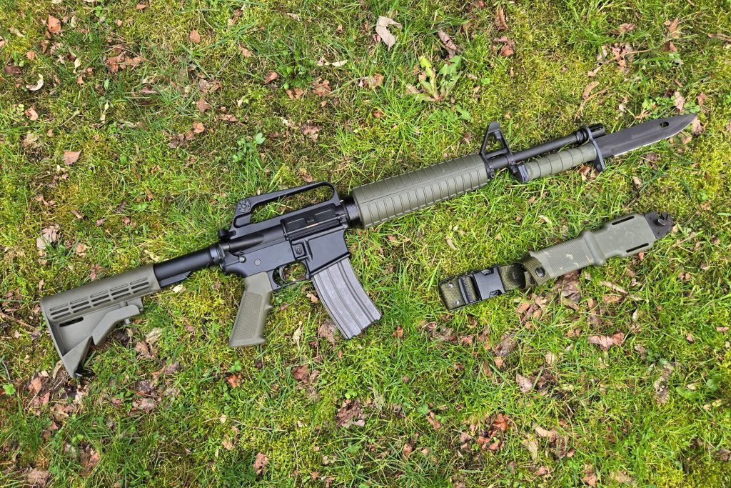 The next build is, in a lot of ways, the little brother of the C7-ish build. This one uses a random lower I’ve had for years, a Dirty Bird A1 upper that I got from AR15Disounts, a 16-inch pencil barrel with FSB with a 1-9 twist from Del-Ton with an A2 flash hider. I used A2-style mid-length handguards, again in OD green and again from MA Parts. Like the C7, I used an A2 front post and A2 rear peep.