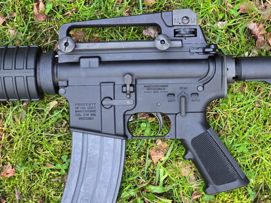 The lower is pretty straightforward M4 with a basic PSA lower parts kit, a fat F3-marked A2 grip, a Mil Spec carbine buffer tube from Luth AR, and a surplus M4 waffle stock with rack number. There’s no cage code on the stock so I suspect it’s actually police surplus, not military surplus. Maybe off of a Bushmaster? I’m calling it close enough, though.