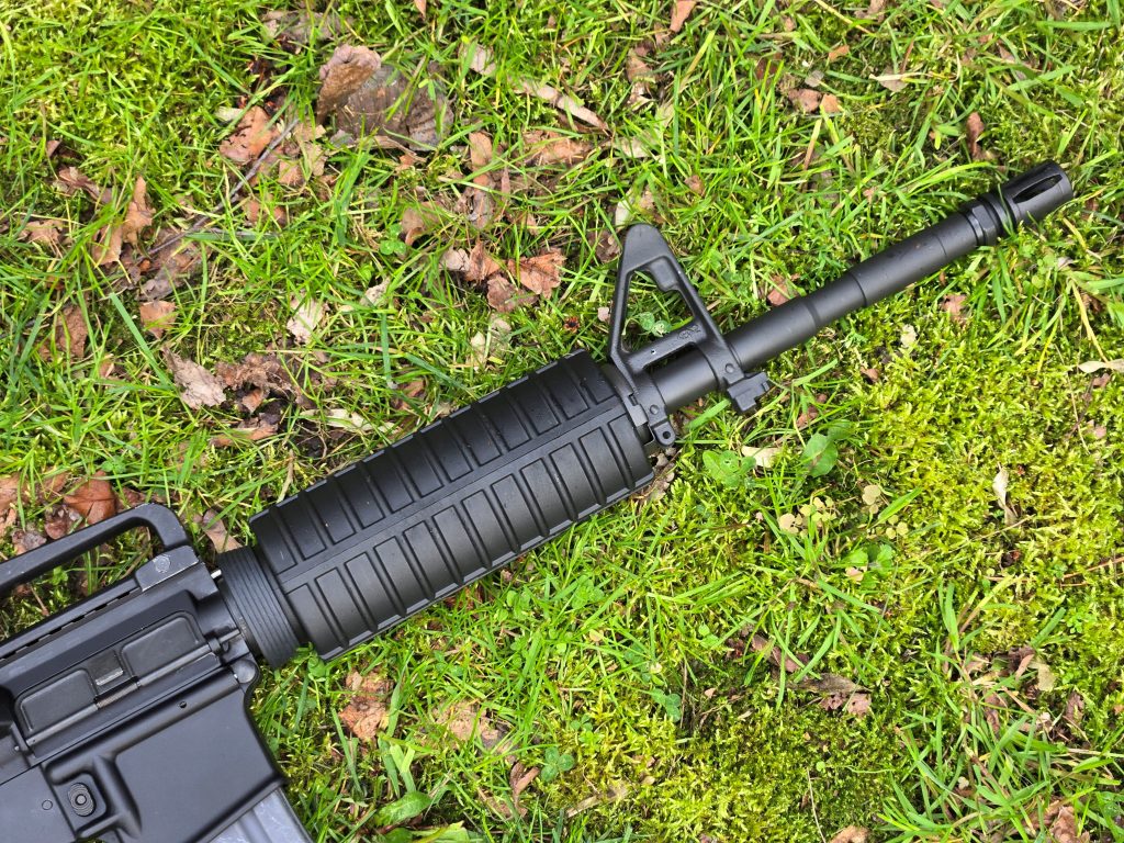 The 14.5 inch, 1:7 twist M4 profile barrel and A2 flash hider are from Luth AR and again the A2 front sight is from MA Parts. The carry handle had the complete rear sight assembly already. The handguards are double heat shield M4 ones from my parts box that came from some trade or another.
