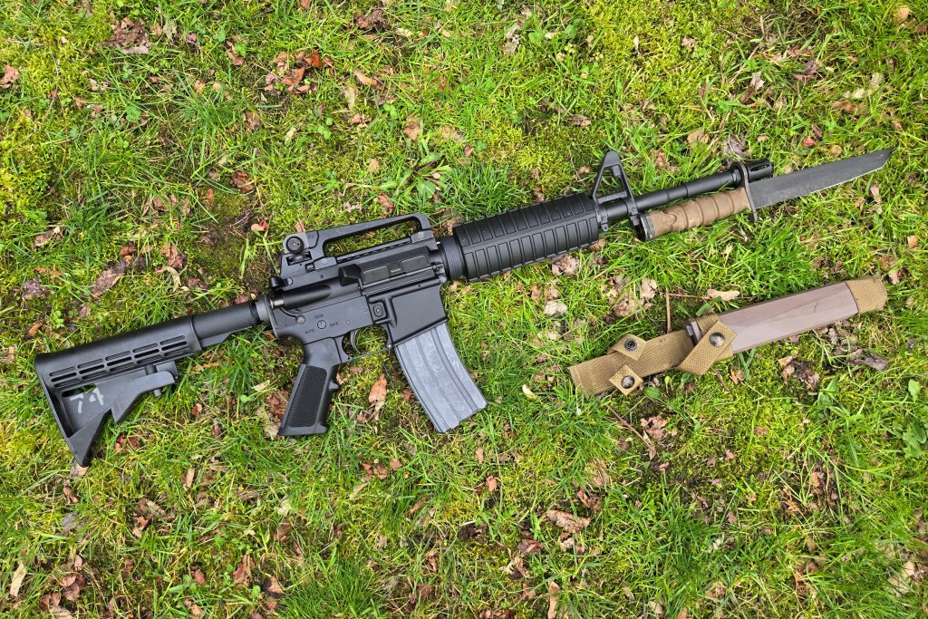 A 16-inch barrel with a carbine gas system has too much barrel protruding past the FSB and bayonet lug and the bayonet slides down well past the flash hider. A 14.5-inch barrel and a mid-length gas system doesn’t have enough barrel protruding past the front sight block to mount a bayonet.