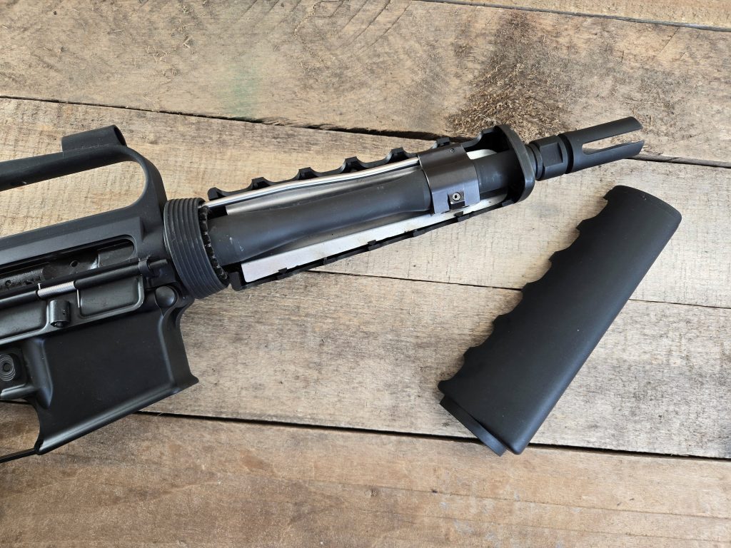 While I was waiting on the upper, I started researching what to do for the barrel. I was unsure how I was going to mimic the K initially. As far as handguards go, carbine-length A1 handguards are readily available now. I’ve had a set for a while waiting on a project so I already had them on hand. I’m pretty sure mine came from Linemount, but JSE Surplus has them as well. I started looking for an 8-inch barrel and pondering what to do for the gas block and end cap. While looking, I stumbled onto Black River Tactical online. It turns out that their barrel setup was exactly what I needed.