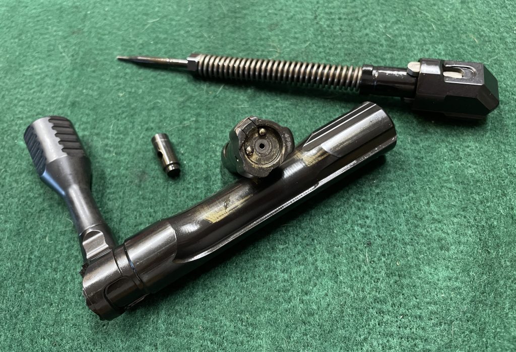 The bolt has a removable bolt face, allowing for easy caliber conversion.