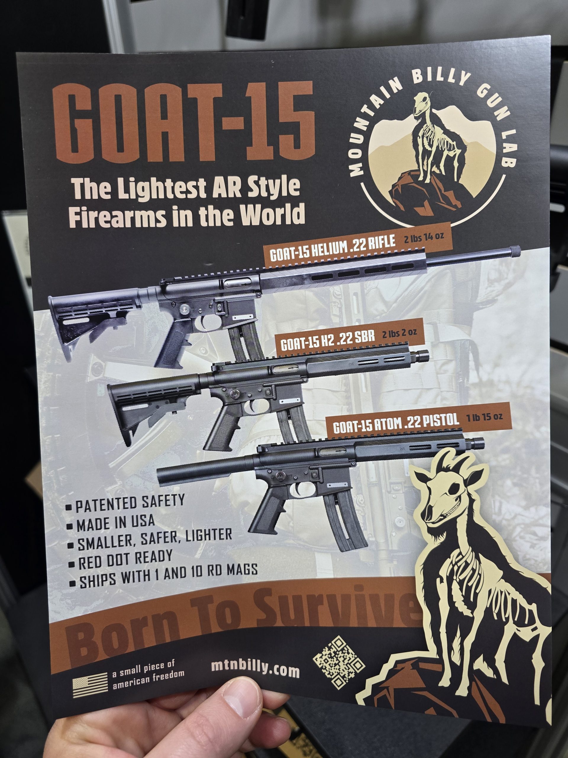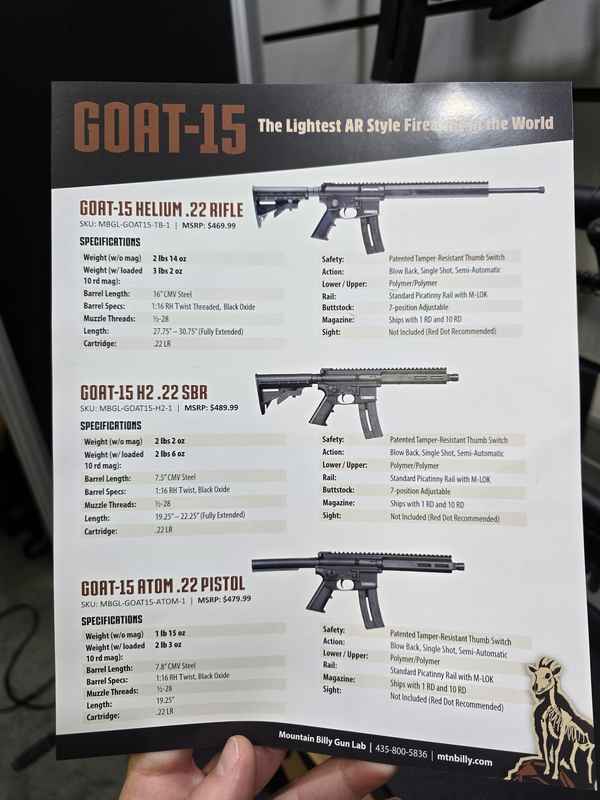 Billed as the lightest semi-auto rifle in the world, the GOAT-15 from Mountain Billy Gun Lab is a scaled-down AR-15 in nearly every aspect. All of their GOAT-15 models weigh under three pounds — at least one model is under 2 lbs! — and they all fire 22 LR and feature a patented safety designed for youth shooting sports.