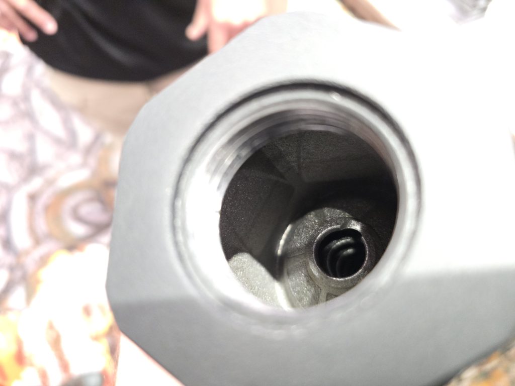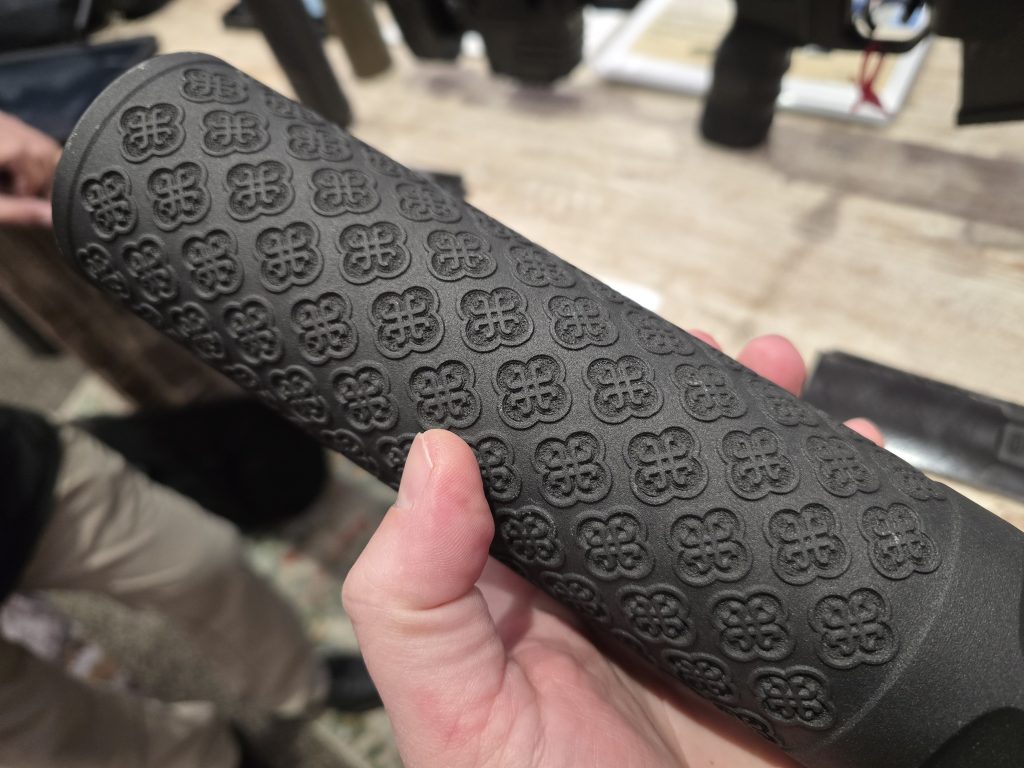 This oversized plastic model demonstrates what Dillon calls their PIP technology, or Purposely Induced Porosity. In some or all (depending on the model) of the logo features, the suppressor is extremely finely porous, kind of like pumice or a sea sponge.