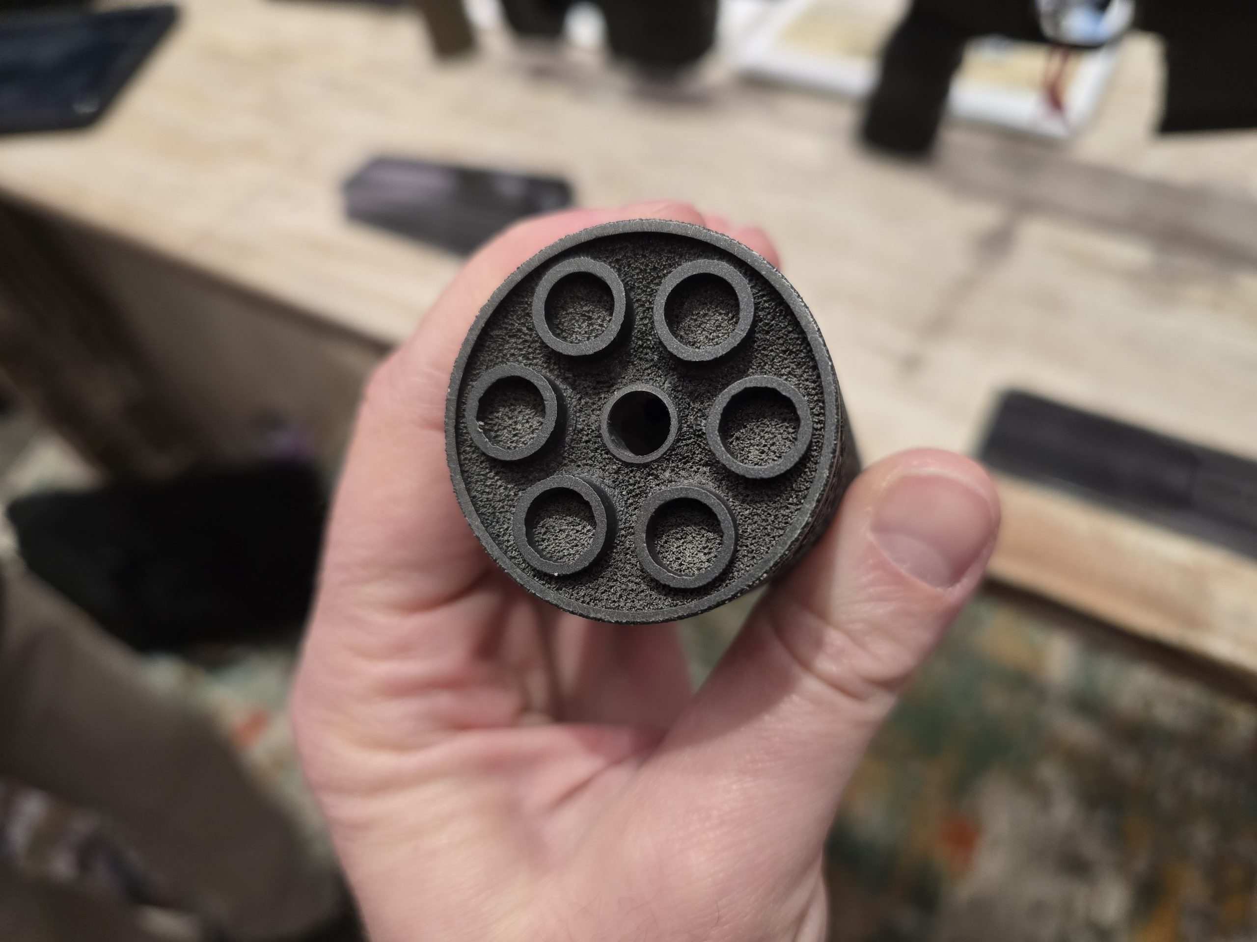 The Minigun-styled muzzle end of the Hush Kit line is porous, too. Dillon advertises reduced backpressure and gas blowback as a feature of these suppressors.