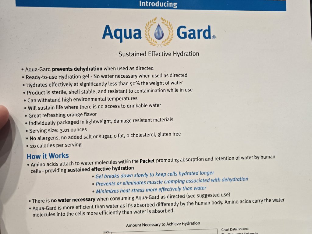 It’s extremely concentrated hydration that you eat rather than drink…and I availed myself of some this year at SHOT Show. Called Aqua-Gard (available on Amazon), it’s ready-to-eat out of the long-term, storage-stable packet and it delivers 3.5 to 4 hours of hydration in just three ounces of product.