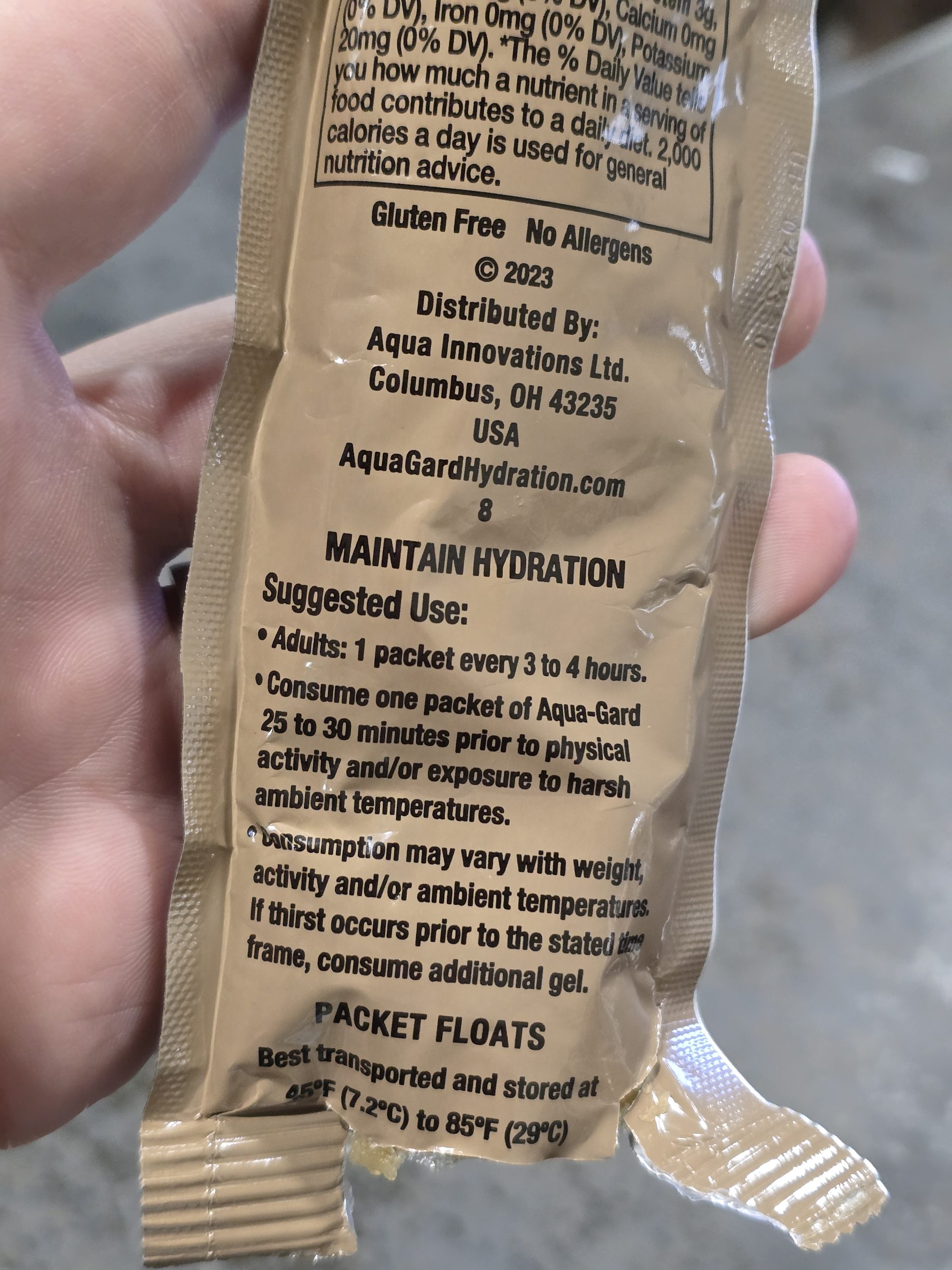 I found the lightly orange-flavored gel perfectly palatable, if slightly boring. It’s easy to consume and, in theory, it kept me hydrated while I did over 17,000 steps yesterday wandering the SHOT Show floor. At the same time, hydrating with Aqua-Gard doesn’t make you pee like hydrating with liquids does. The gel has the absolute bare minimum amount of liquid in it to make it edible and functional.