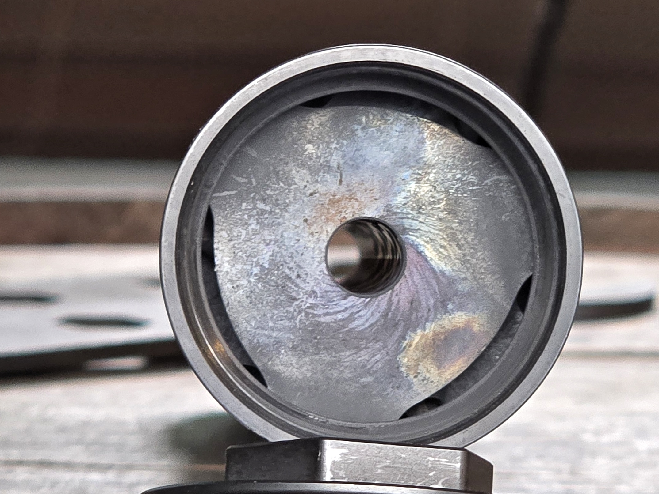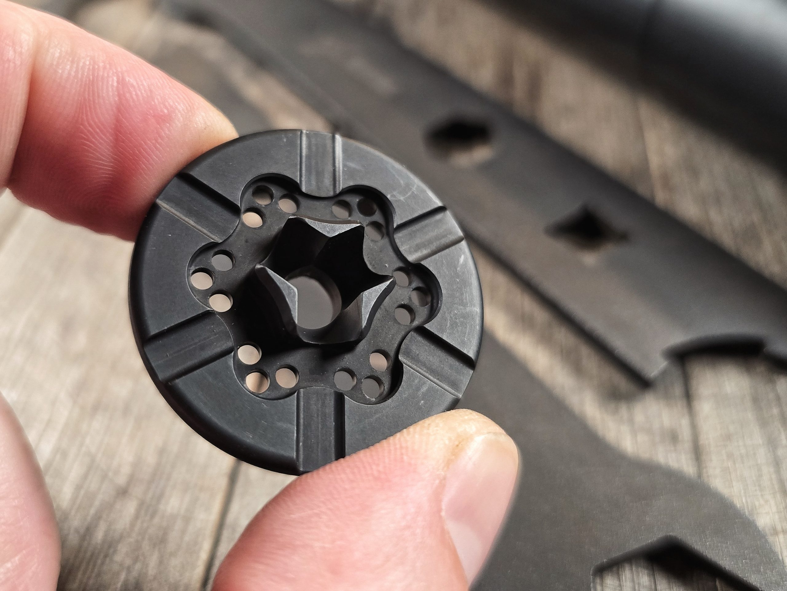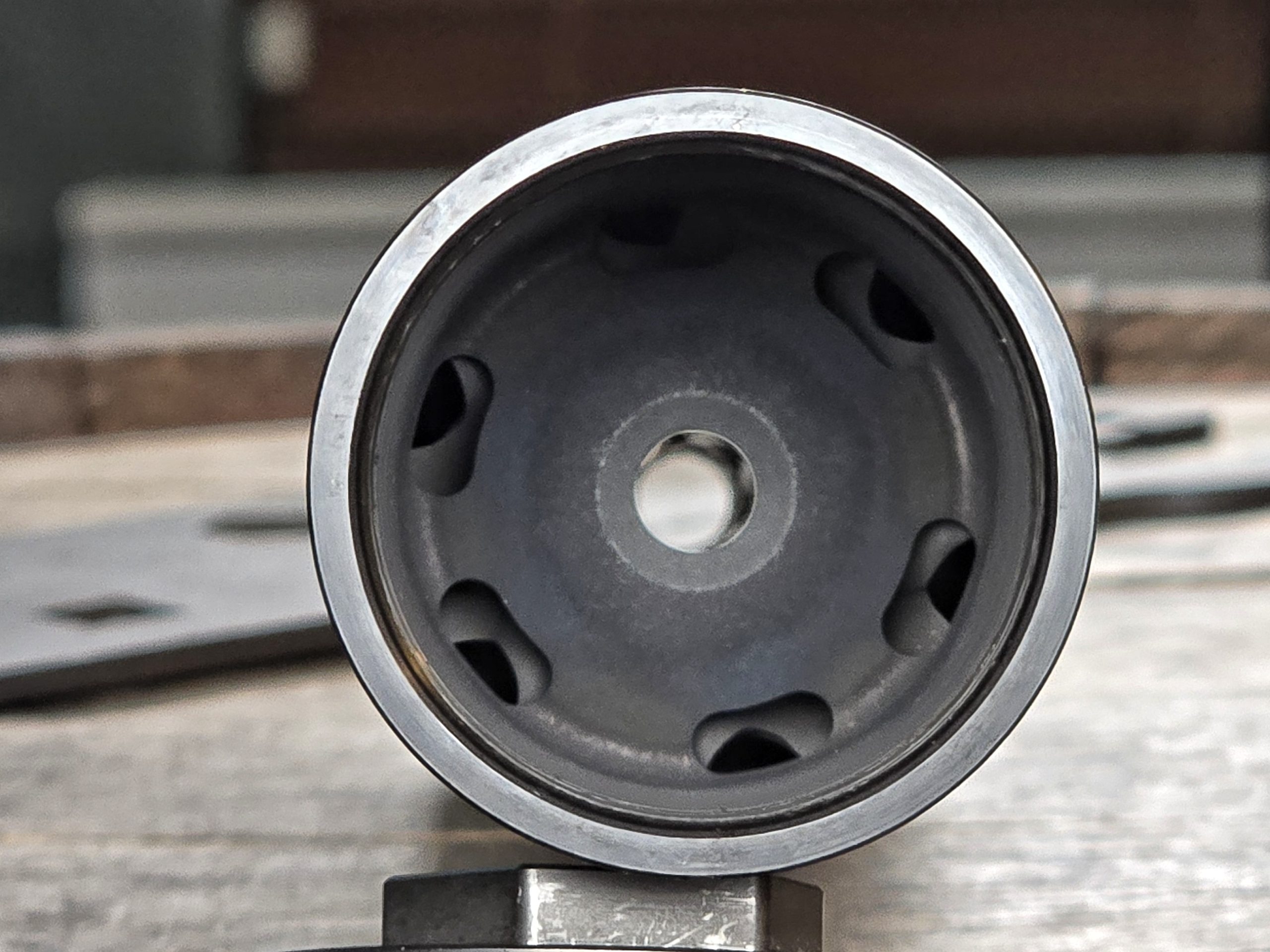 There is precedent for this concept, which can be seen in the ROC556’s only actual baffle, its blast baffle. Modern suppressor design has moved away from using blast baffles with a steep cone with a thin wall around the bore and sharp edges to a design more like what’s seen above; a shallow cone with a thick or rounded wall around the bore and gas ports around the circumference to encourage gas and pressure to travel along the periphery instead of through the bore.