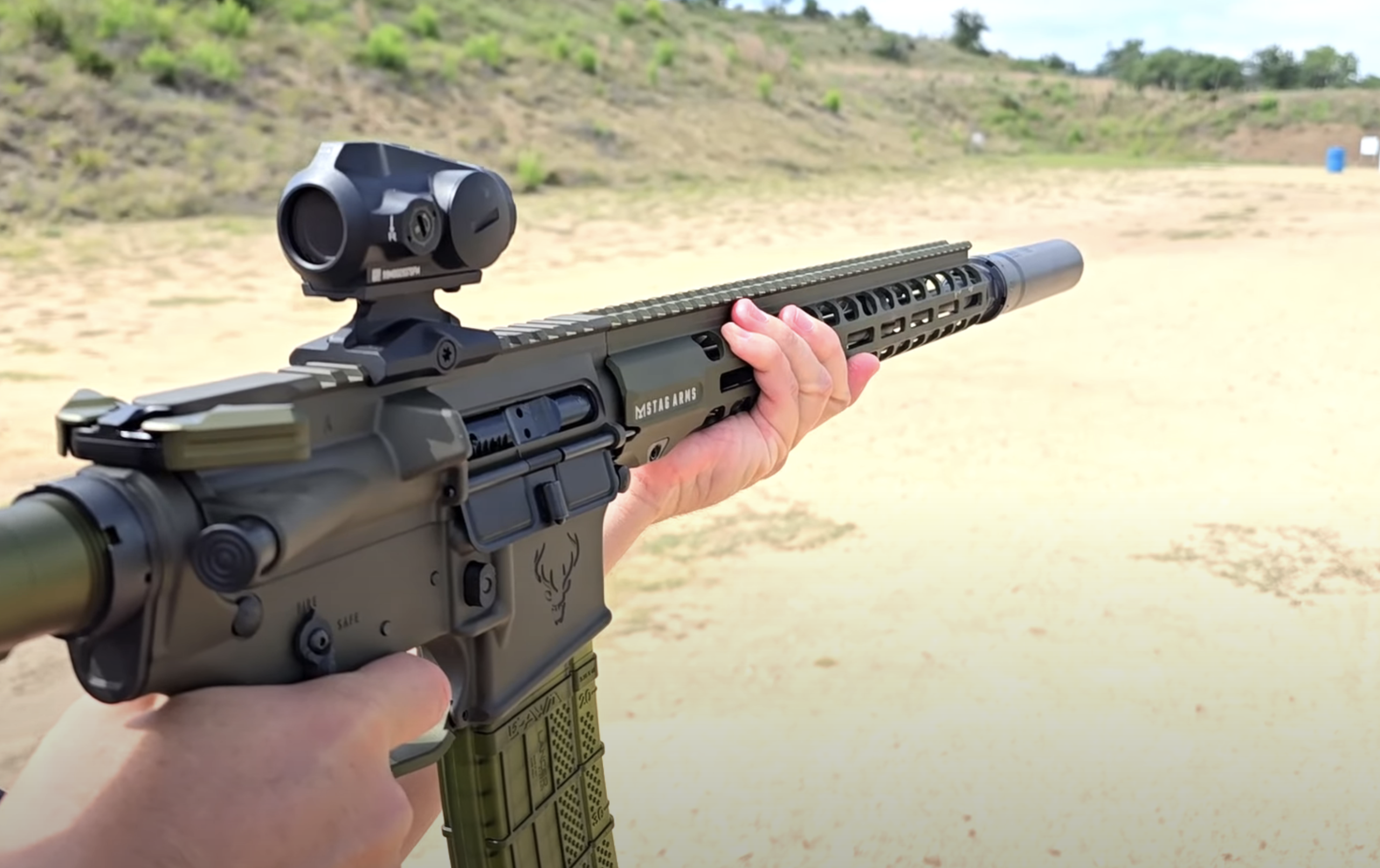 Out on the range at Copperhead Creek Shooting Club we slapped the Siege ROC556L on a Stag Arms Stag 15, which is an excellent rifle but is, at the same time, a totally “standard” AR-15 in its layout and operation. This bad boy has a mid-length gas system with a non-adjustable gas block that provides plenty of gas for the system to work with and it has a standard weight bolt carrier group, buffer, and buffer spring.