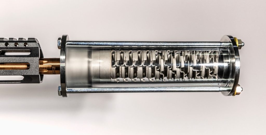 As you can see in the slow motion video from that Lexan-bodied suppressor, the Linear Diffuser Array appears very effective at slowing down the combustion gases by providing a complicated exit path. Delaying the gas allows it to cool, allows pressure to drop, and results in the sound suppression we look for from a firearm silencer.